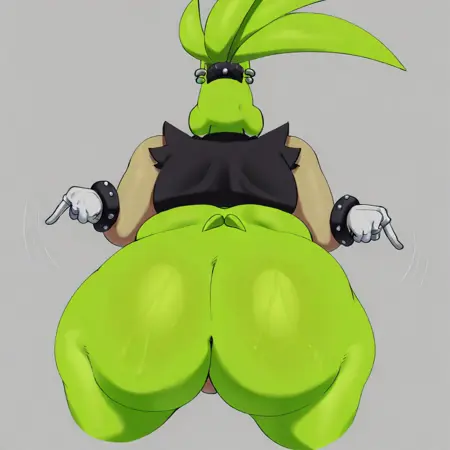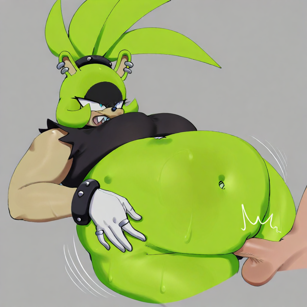Surge The Tenrec, tenrec, bright green fur, a patch of black countershading on her face and eyelids, angular teal eyes, peach snout, medium-long black nose, upturned sideburns on each side of her head, peach-skinned arms, spiky quills, ponytail, black hairband with silver studs, tiny nub tail split in two, sharp teeth, tall vertical flat ears, fat, curvy, silver earrings, black shirt with torn-off sleeves, white gloves with black cuffs and silver studs, a silver ring on each of her index and ring fingers, yellow and baggy pants with black stripes, black belt with a round and silver belt buckle, yellow and white shoes