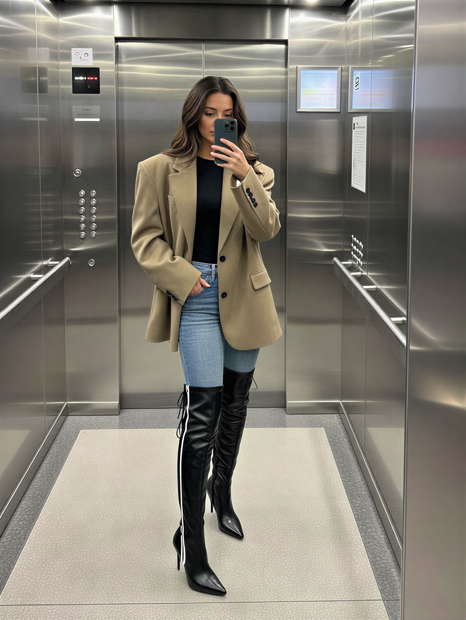A vertical mirror selfie taken inside a modern, polished elevator. An influencer woman is holding her smartphone, posing to show off her outfit which includes an oversized blazer, light blue slim jeans, and lora_black_thigh_boots. black thigh high boots, rear lace up boots, back lacing details, white side stripe, prominent white stripe, stiletto heel boots, pointed toe boots, shiny leather boots, Bright elevator lighting, metallic reflections, social media aesthetic, trendy look, sharp focus.