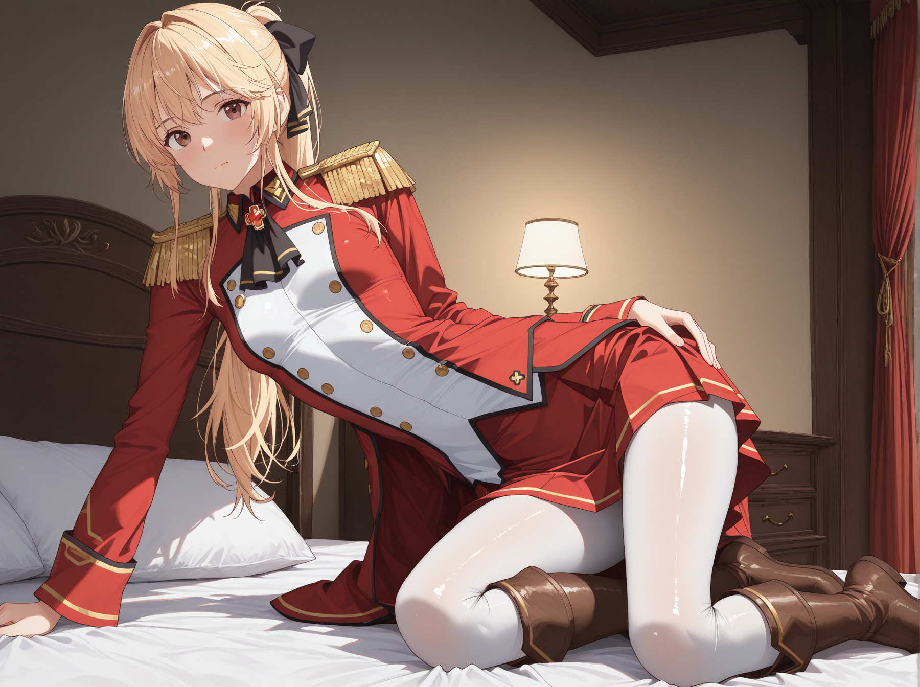 Clothes: (military uniform, red jacket, epaulettes, long sleeves, brooch, red skirt, white leggings, brown boots)