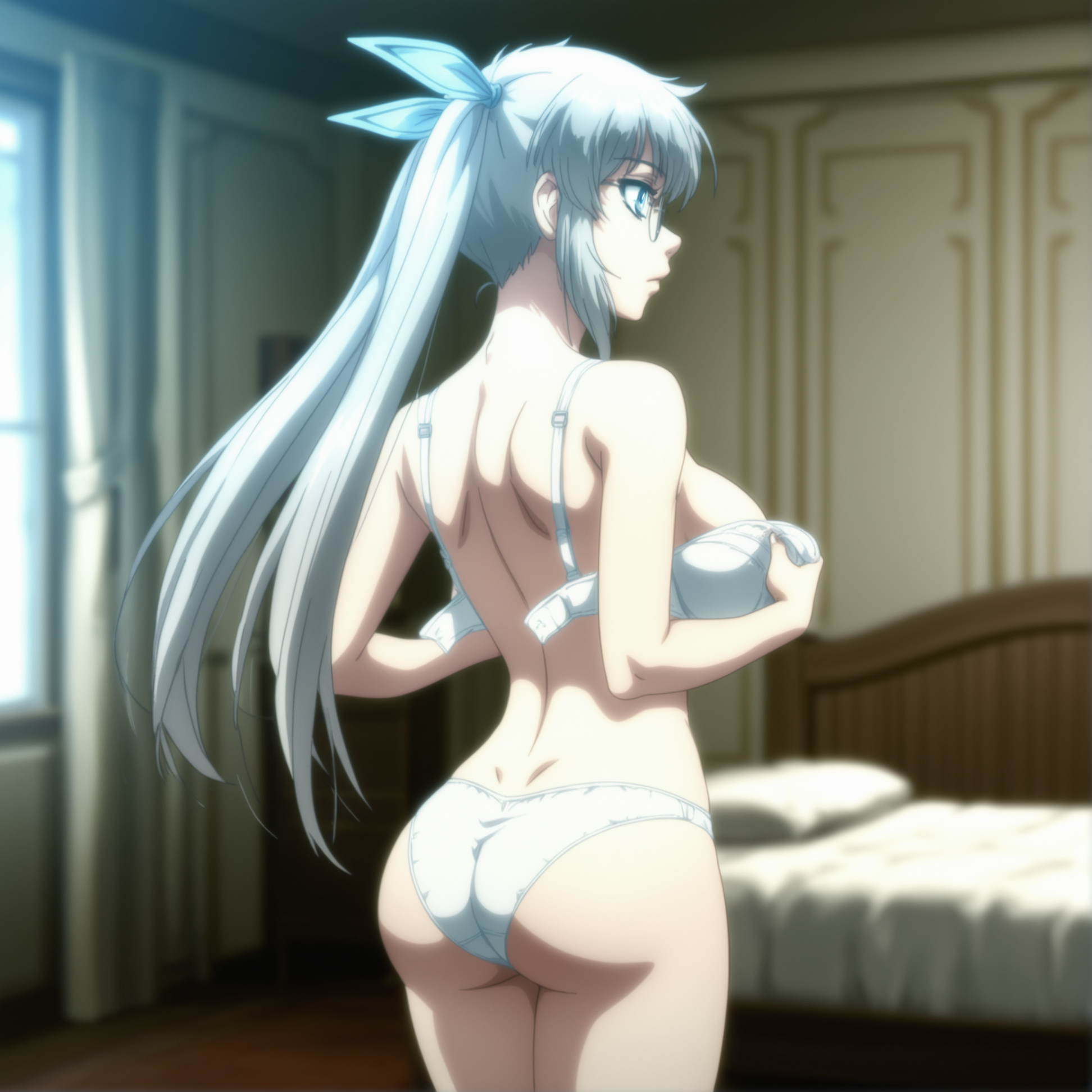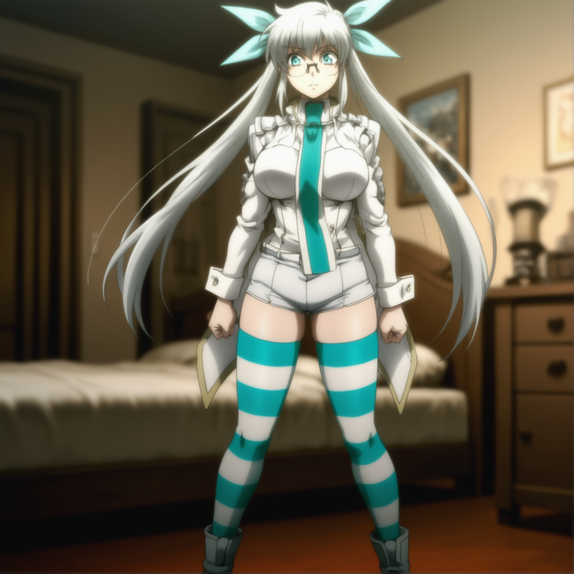 olminedrifters, solo, 1girl, large breasts, blue eyes, glasses, grey hair, long hair, twintails, hair_ribbon