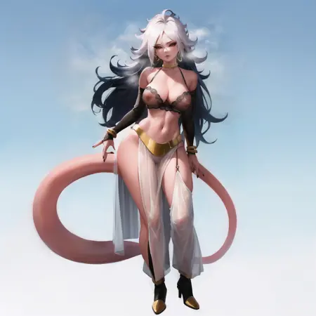 オリジナル衣装を再現する場合:lora:MajinAdnroid21v118:0.7(majin android 21, 尻尾, 黒い虹彩, 赤い目, 白髪, 長い髪, リングイアリング, 腕輪, 黒いつめ, トゥーブタンプ, 黄色のチョーカー, ホワイトハレムパンツ, 裾のない袖)