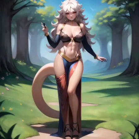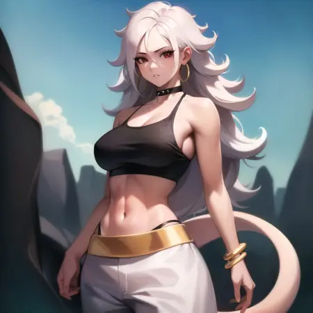 그녀의 원래 옷을 유지하고 싶으시면: lora:MajinAdnroid21v118:0.7(마진 엔드로이드 21, 꼬리, 검은 눈백, 빨간 눈, 흰 머리카락, 긴 머리카락, 고리 귀걸이, 팔찌, 검은 손톱, 튜브 탱크탑, 노란 목줄, 흰색 하렘 팬츠, 분리형 소매)