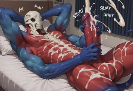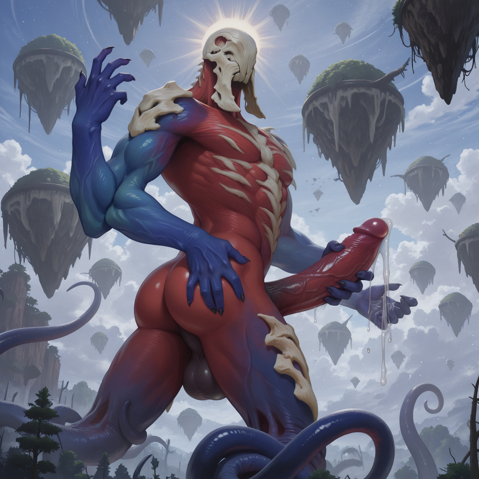 태그: 엘드리치 비정상, 뼈 마스크, 붉은 피부, 파란 팔, 괴물, 드러난 뼈, 입 없음, 눈 없음, 인간 없음, 촉수 다리, 추가 팔, 외계인, 거대