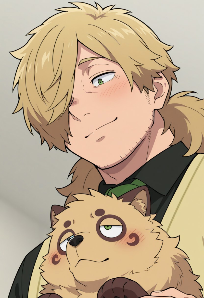 1boy, brown-round fur on eyes, inugami_tanuki, yellow fur, brown paws, hair over one eye, green eyes, sanpaku,