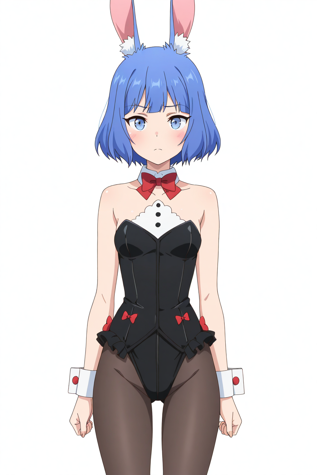 1girl, bunny suit, black bunny outfit, strapless leotard, sweetheart neckline, red bowtie, high cut leotard, red ribbon accents, red bows, wrist cuffs, white wrist cuffs, black pantyhose, small breasts, adult
