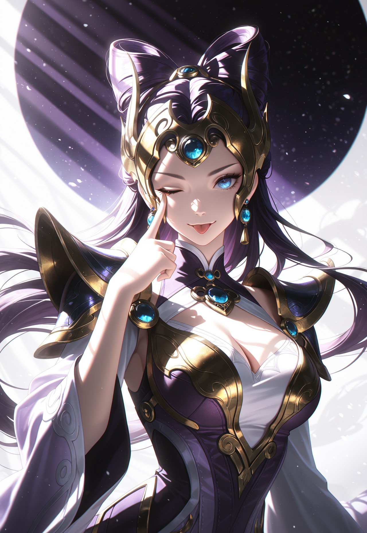 LGdiana, long hair, dark purple hair, looped bun, blue eyes, earrings, facial armor plates, light purple dress, decorated shoulder plates, wide sleeves, multicolored dress, knee-high boots,