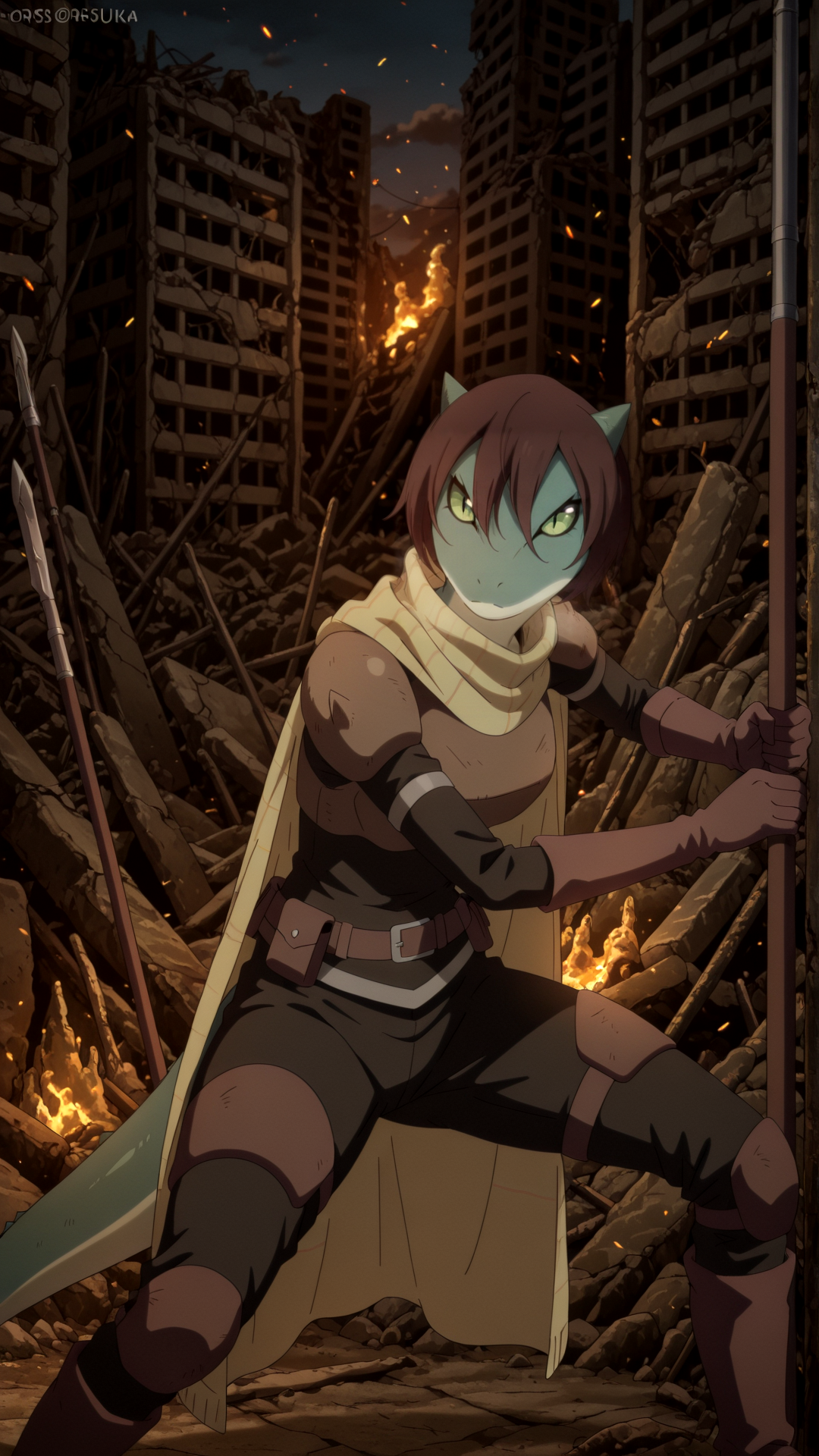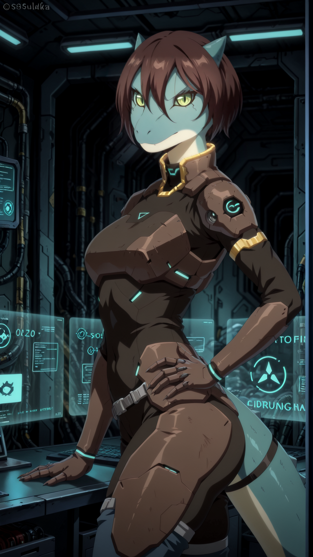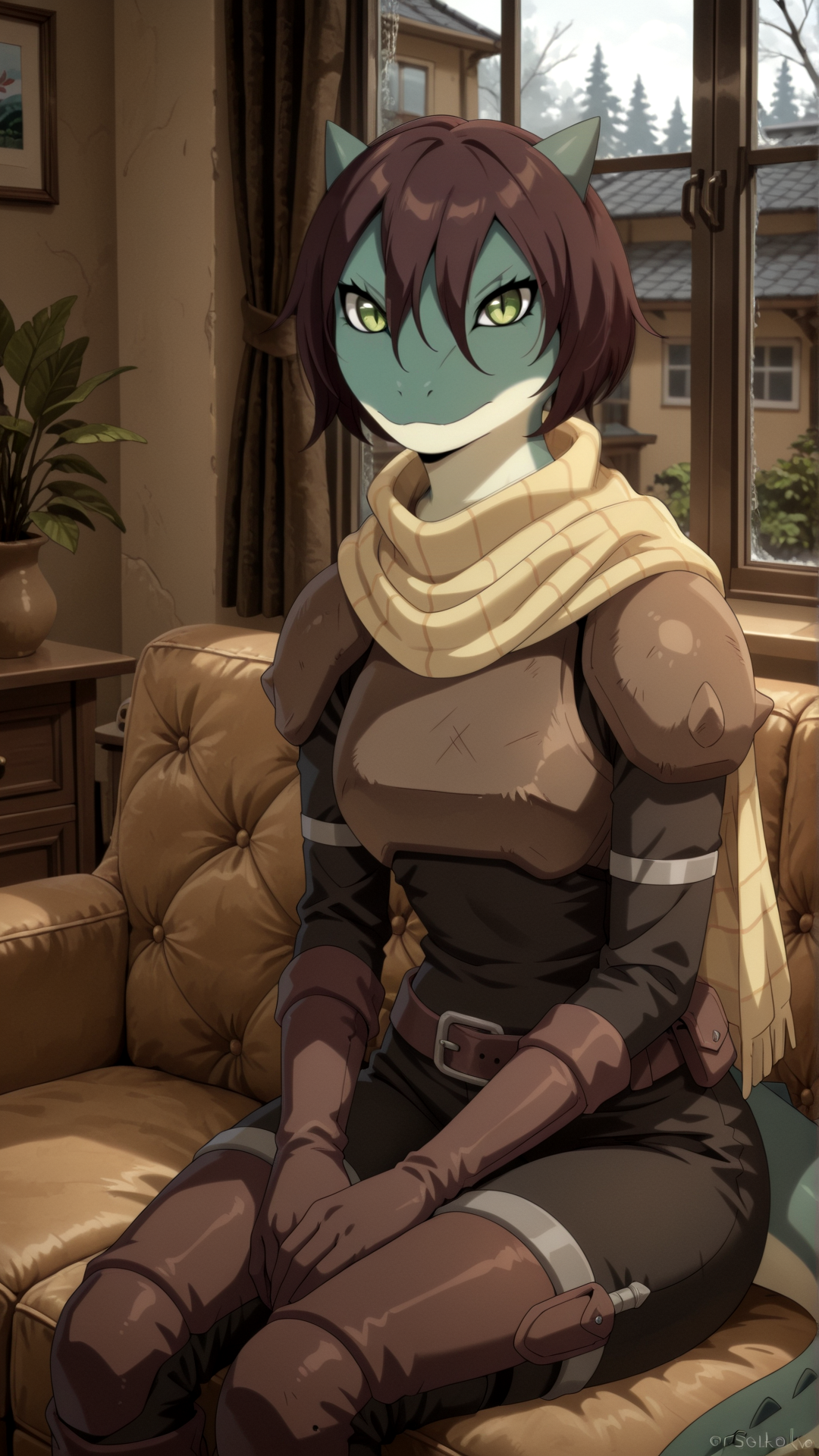 1girl, s0uka, furry female, lizard girl, horns, short hair, armor, scarf, brown hair, green eyes, hair between eyes,