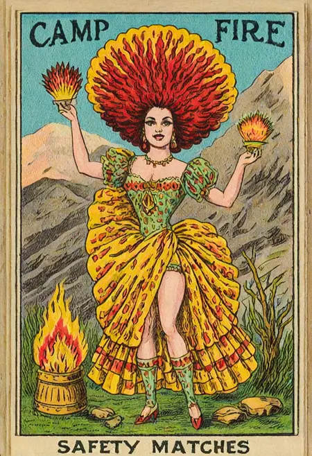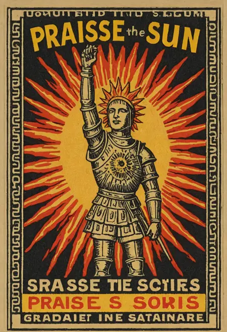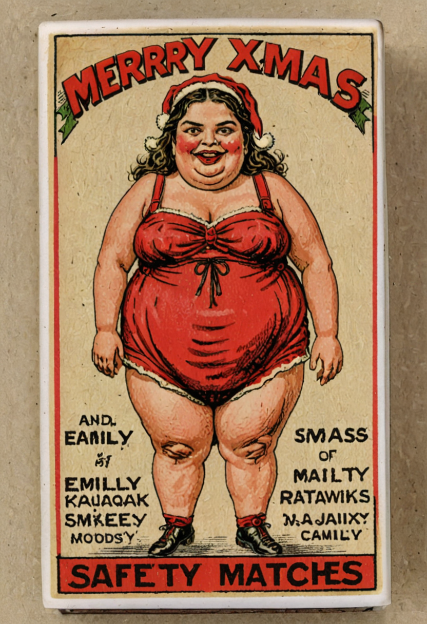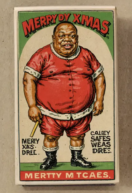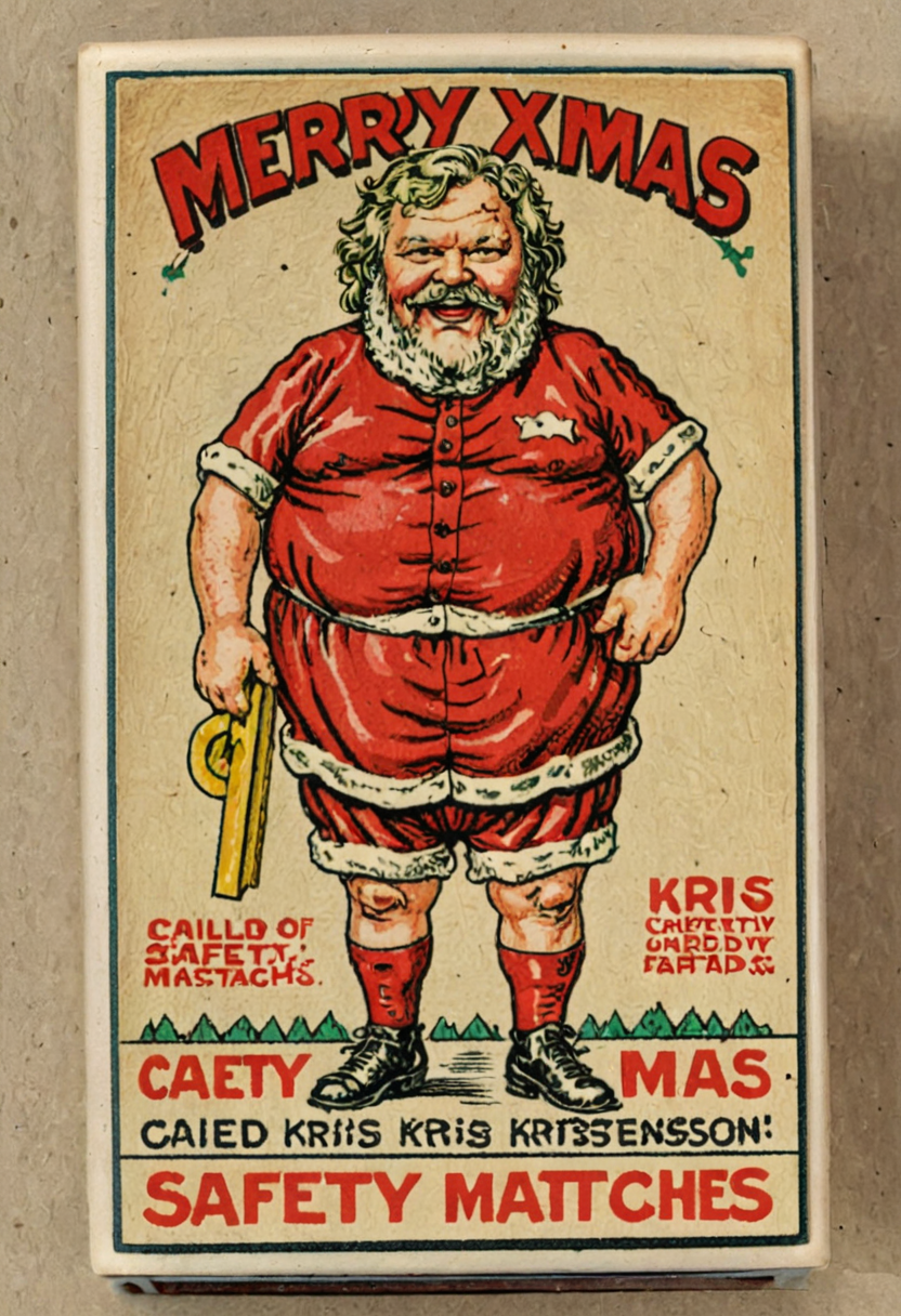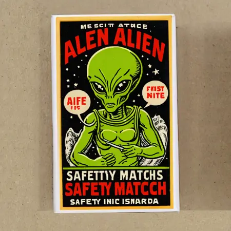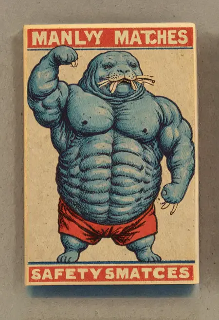 Example: Vintage matchbox artwork, with a minimalistic woodcut print depicting a manatee. The title say "MANLY MANATEE MATCHES". On the bottom a text reads "FOR REAL MEN -atees"