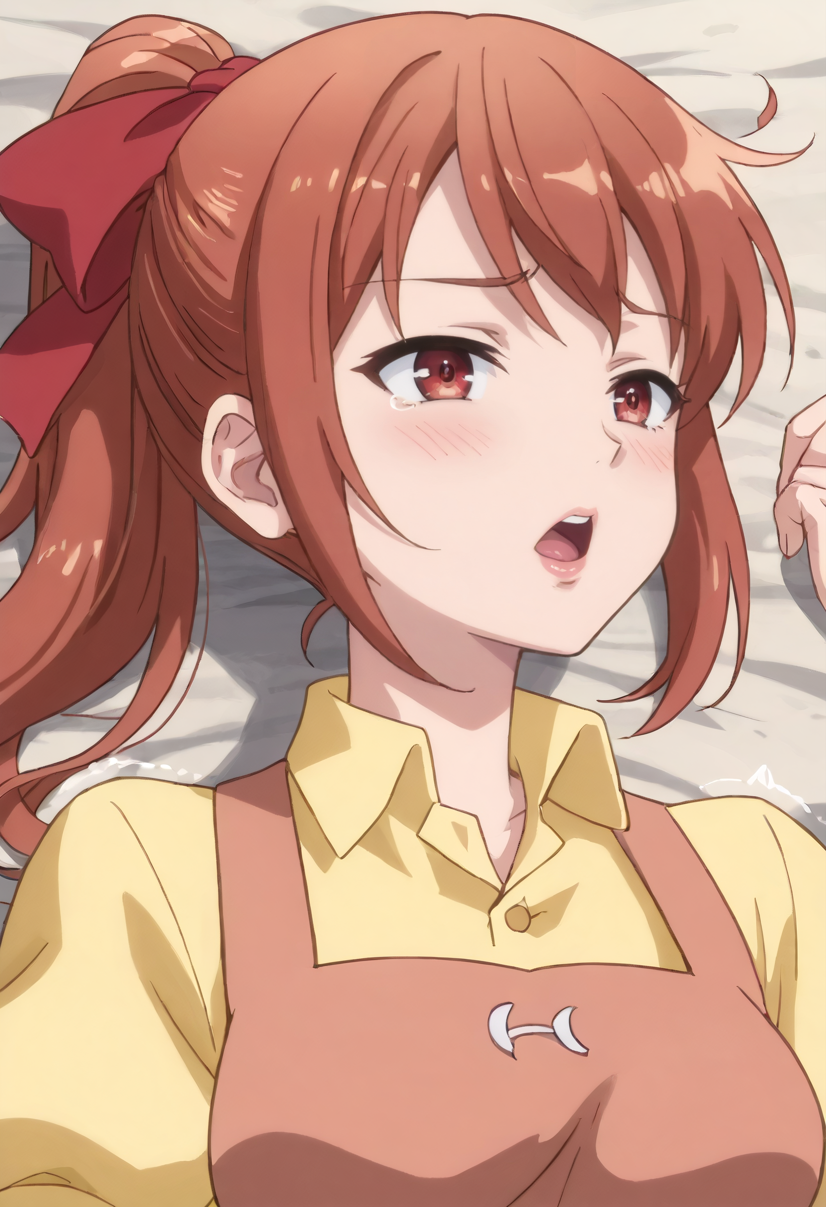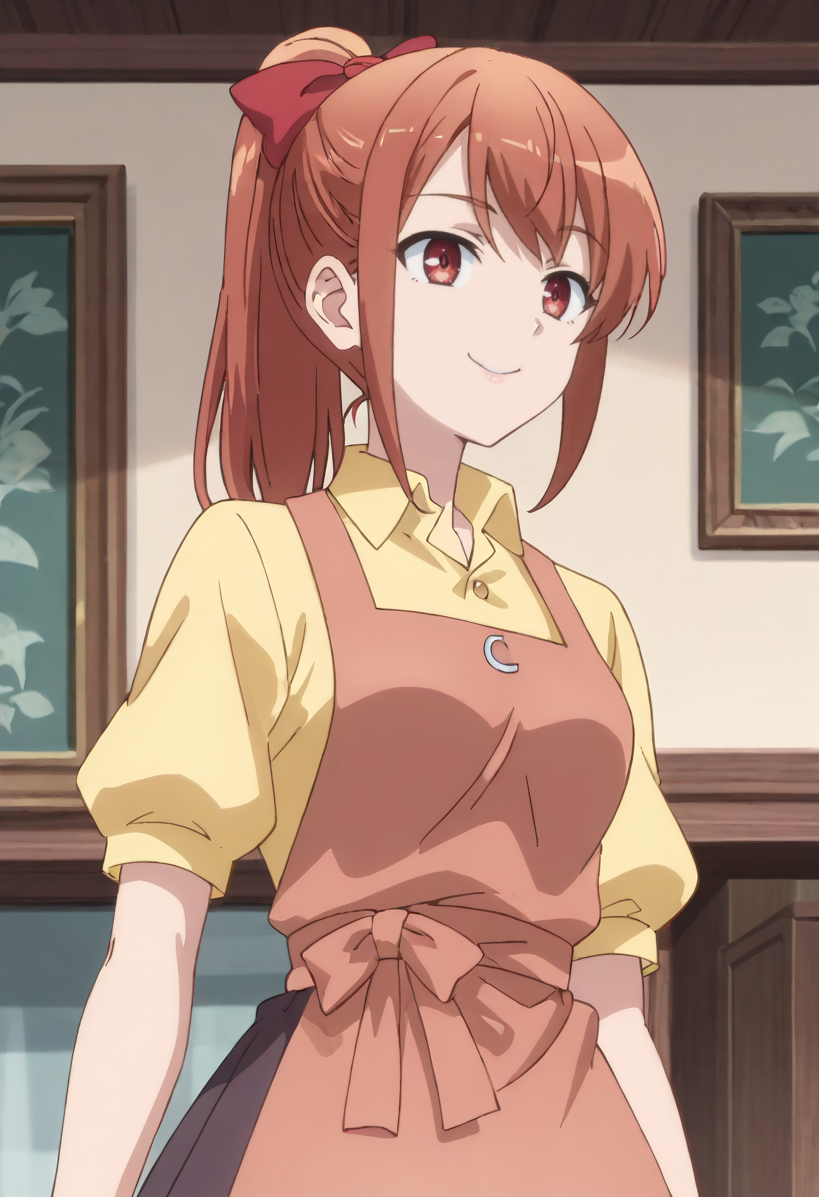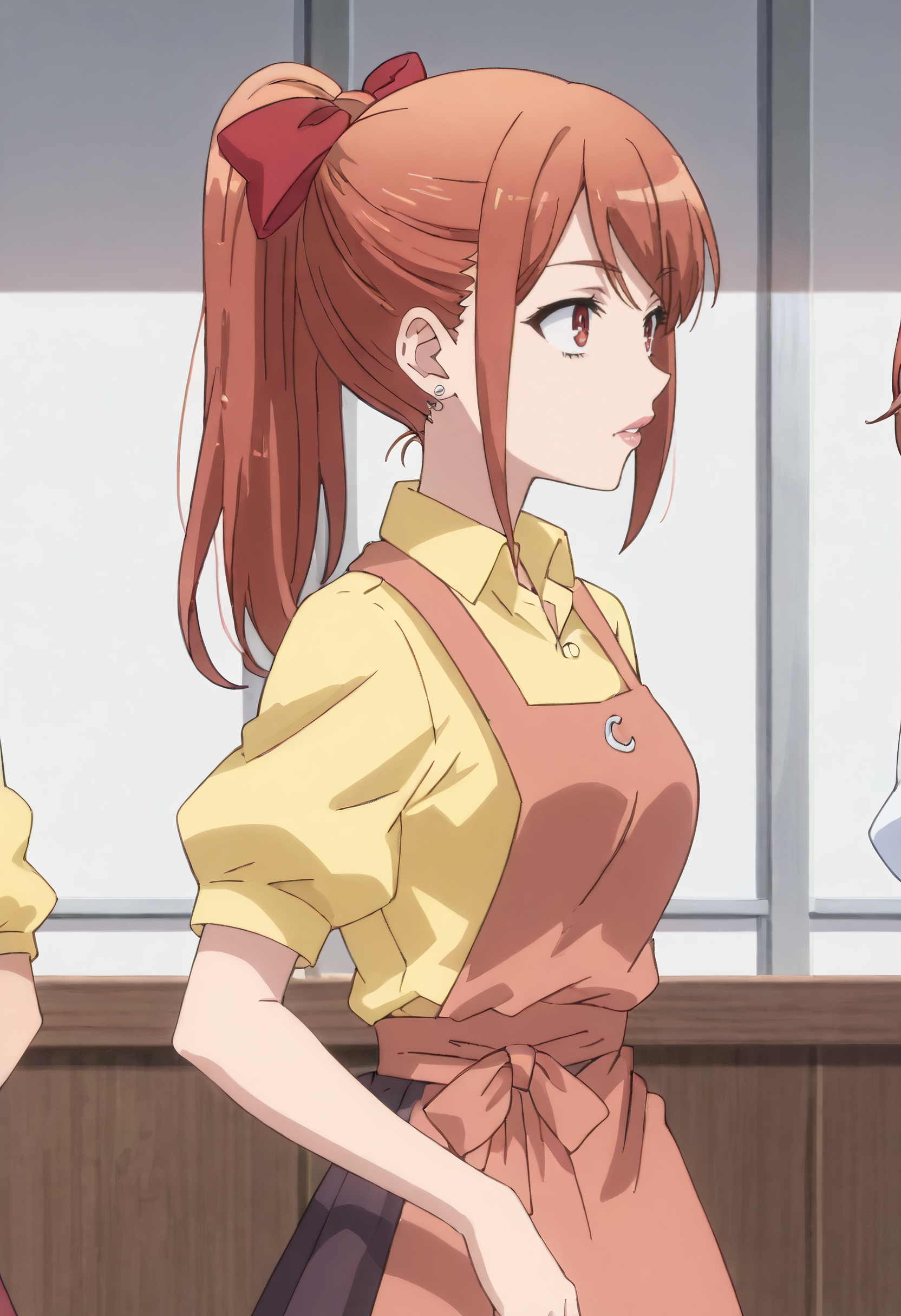 MicahOutfit, 앞치마, 셔츠, 리본, 노란 셔츠, 머리 리본, 칼라 셔츠, 활, 머리 활, 퍼프 소매, 빨간 앞치마, 짧은 소매, 빨간 활, 퍼프 짧은 소매, 치마,