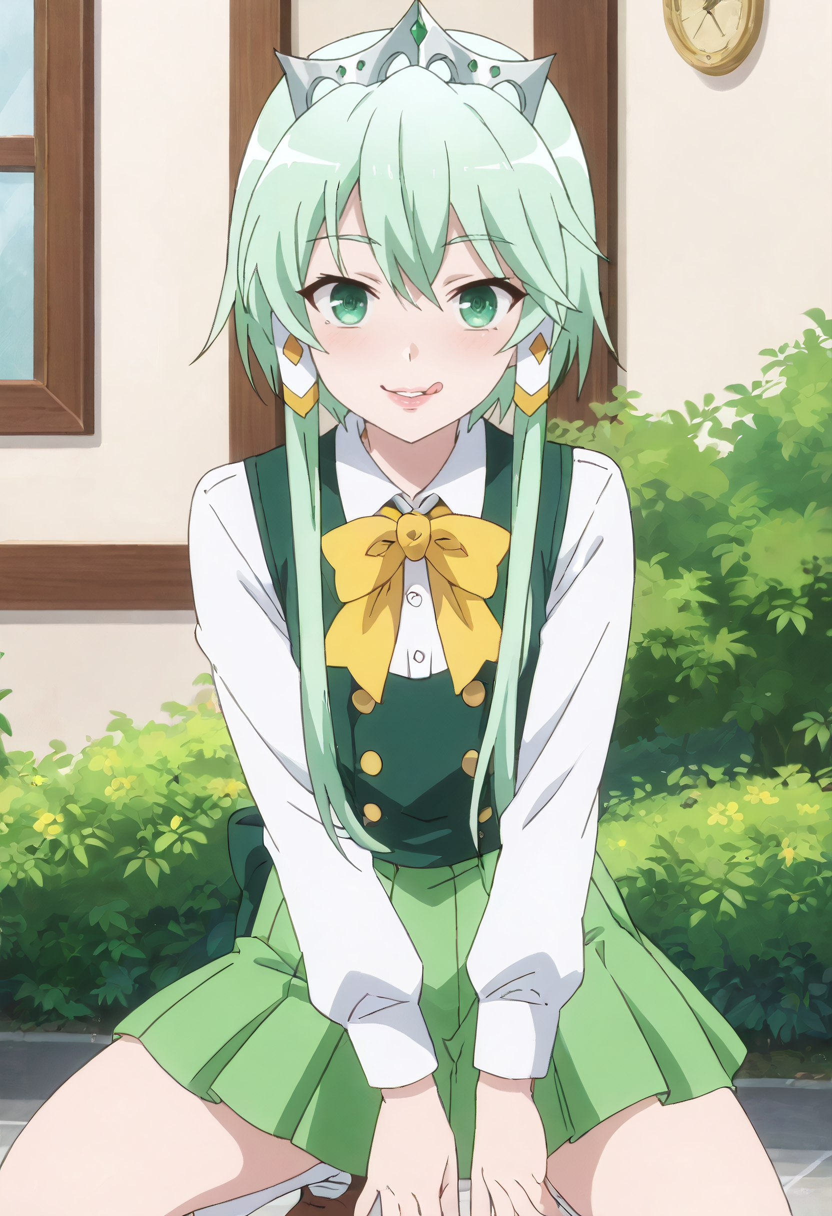 LuciaOutfit、ティアラ、王冠、長袖、リボン、ふわふわ袖、緑のリボン、ベスト、ジュリエット袖、ドレス、緑のネクタイ、ジュエリー、シャツ、白いシャツ、スカート、レギンス、黒いレギンス、ネクタイ、白いスカート、髪飾り、リボン