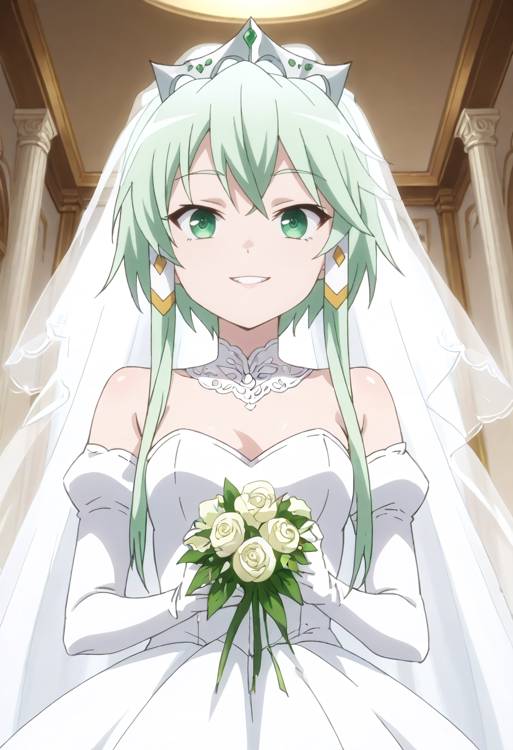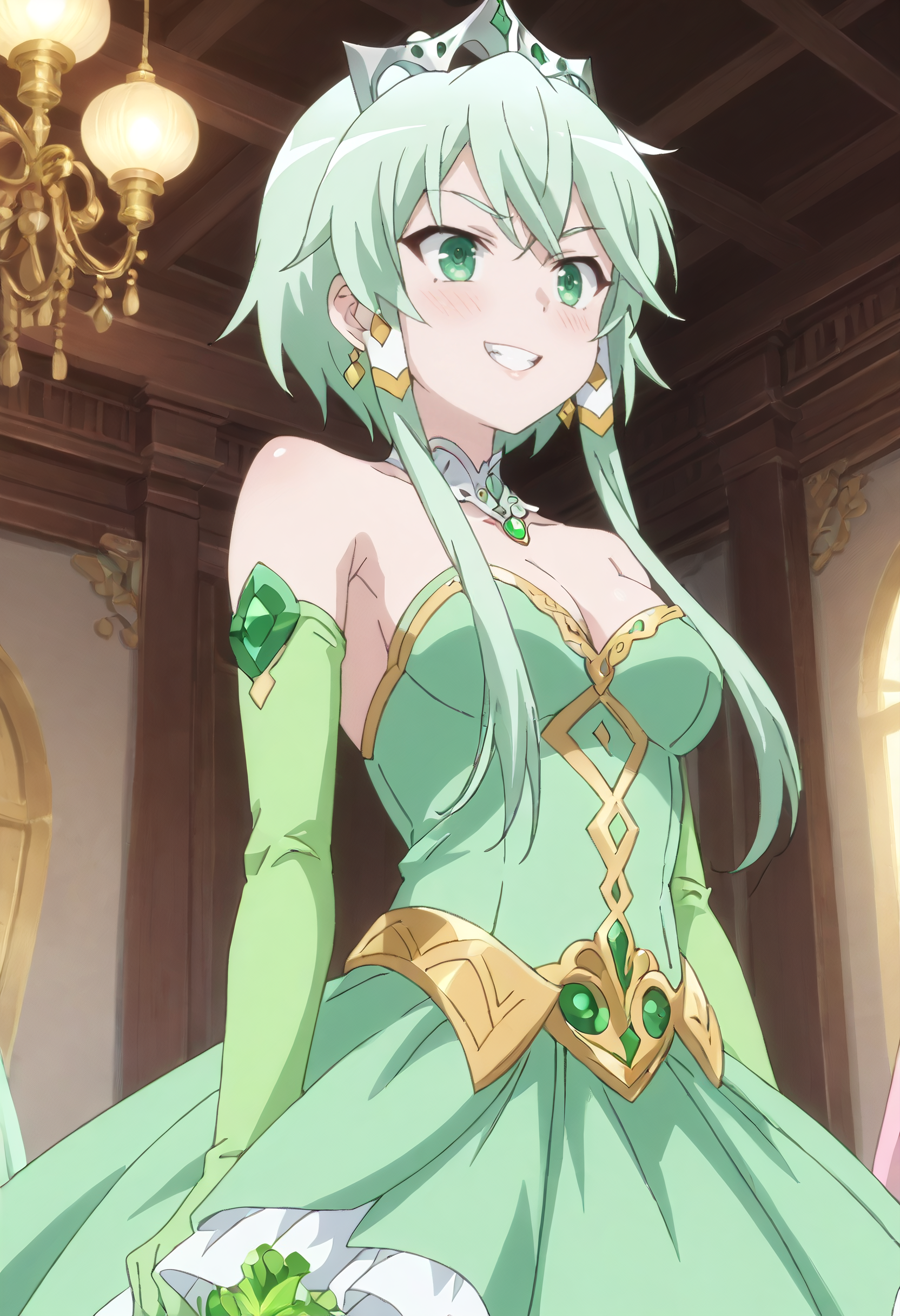 LuciaRoyal、肩出し、ドレス、ティアラ、ジュエリー、緑のドレス、手袋、緑の手袋、胸元、王冠、肘まで手袋、取り外し可能カラー、ディアデム、髪飾り、取り外し可能袖、プリンセス、ストラップレスドレス、ストラップレス、緑の宝石、チョーカー、ガウン、イヤリング、オフショルダードレス、オフショルダー