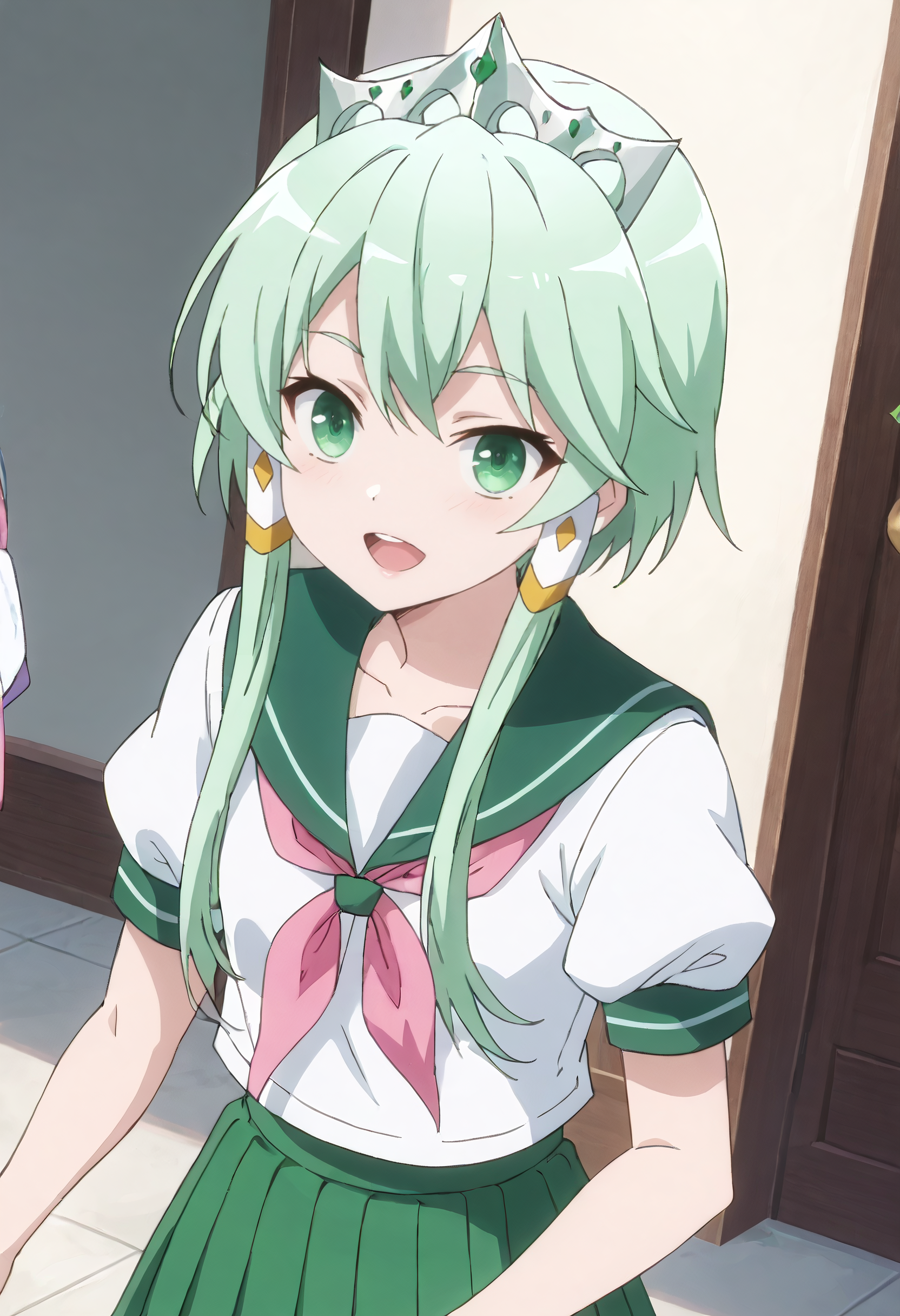 LuciaSchool、学校制服、セーラー服、ティアラ、緑のセーラーカラー、セーラーカラー、短袖、王冠、リボン、ネクタイ、白いシャツ、シャツ、ピンクのネクタイ、スカート、緑のスカート、レギンス、プリーツスカート、ピンクのリボン、ふわふわ短袖、セーラーシャツ