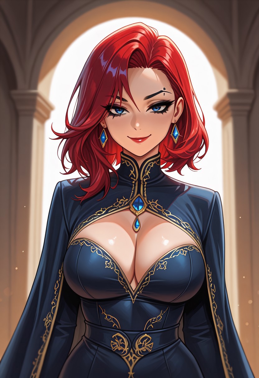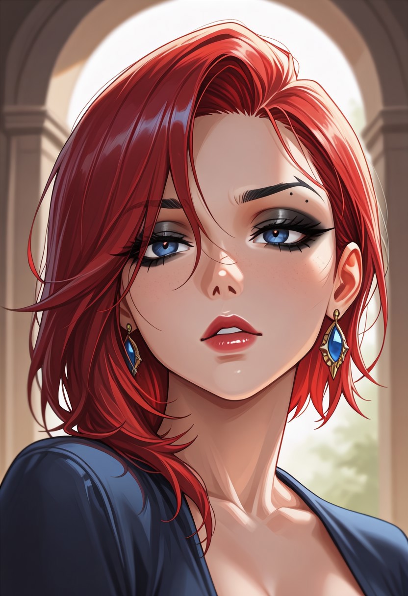 1girl, milf, red hair, medium hair, asymmetrical cut, eyebrow high-arch, dark blue eyes, red lipstick, earrings, curvy body,