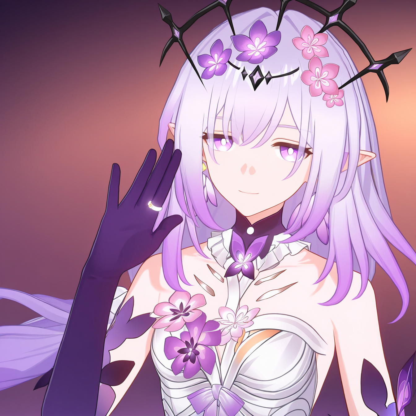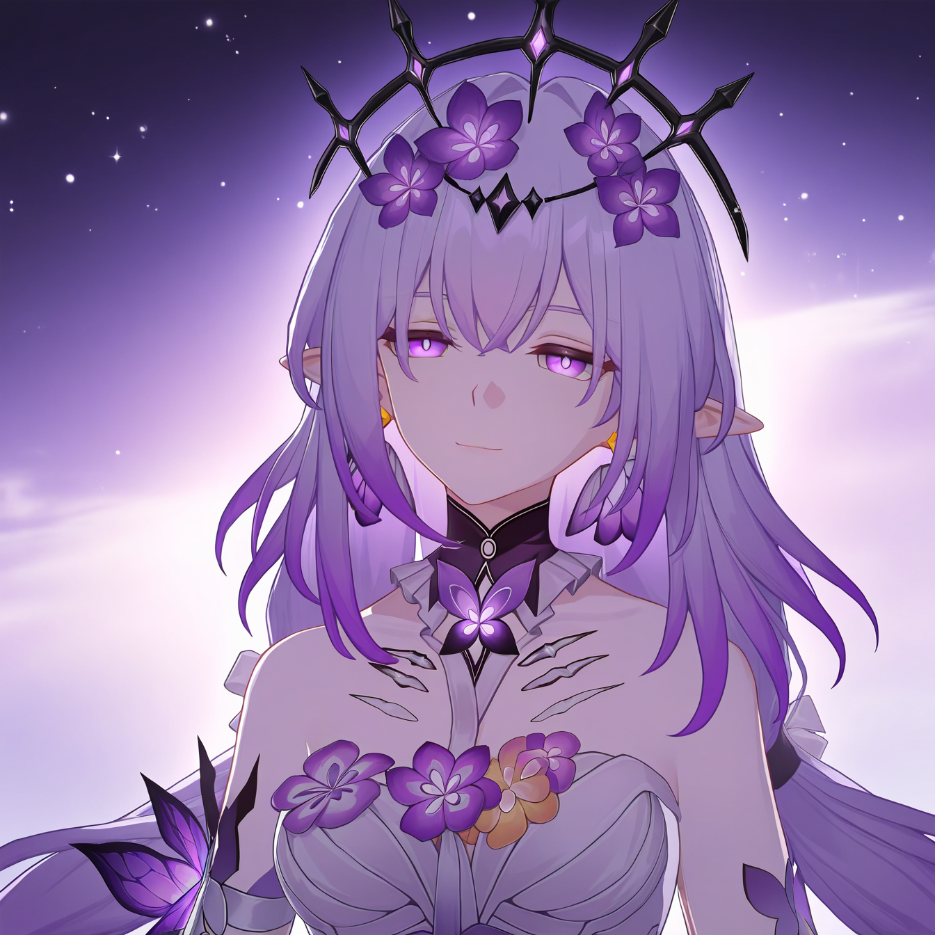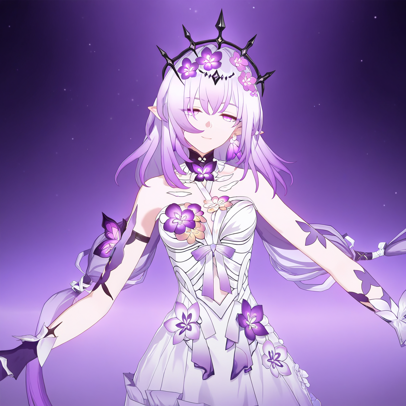 masterpiece, best quality, amazing quality, very aesthetic, 1girl, Castorice, solo, purple eyes, long hair, purple hair, pointy ears, gradient hair, dress, flower, bangs, hair ornament, hair flower, white dress, earrings, black crown, looking at viewer, detailed light, epic, dramatic, smile,