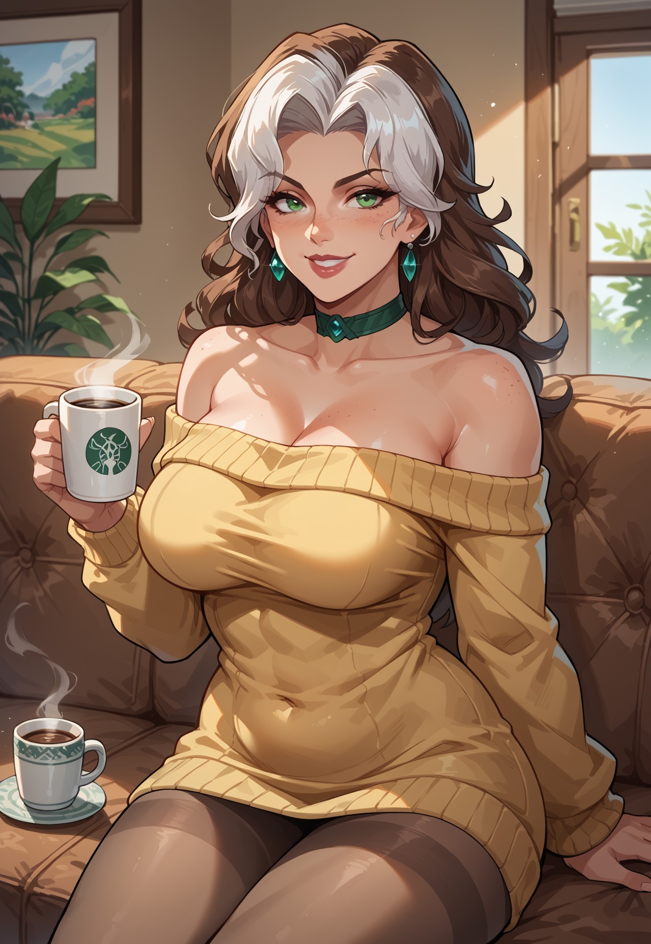 Rogue_Rivals, 갈색 머리카락, 흰색 앞머리, 이색 머리카락, 녹색 눈, 긴 머리, 곱슬머리, 볼륨 있는 앞머리, 주근깨, 곡선형 몸매,