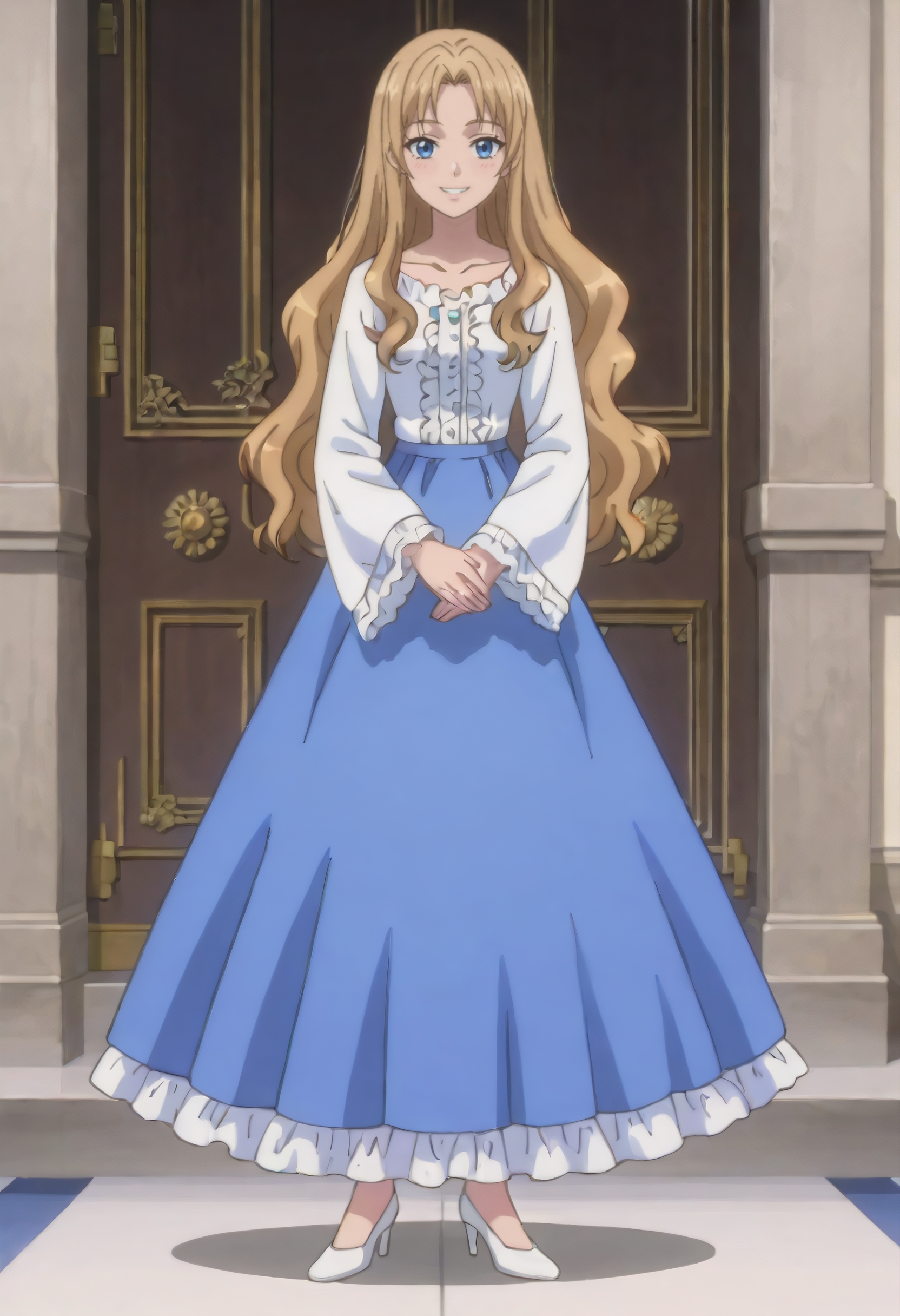 EllenDress,蓝裙子,长袖,长裙,裙子,衬衫,荷叶边,连衣裙,白色鞋履,鞋子,高跟鞋,白衬衫,荷叶边裙,宽袖,