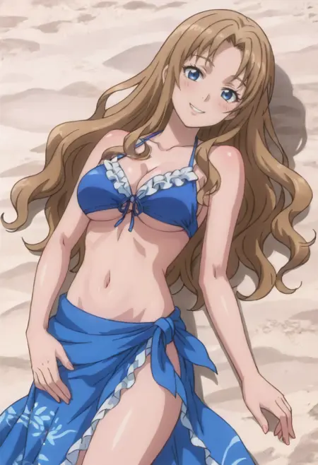 EllenBikini,纱笼,泳装,比基尼,蓝色纱笼,蓝色比基尼,棕发,肚脐,胸部显露,下胸显露,荷叶边比基尼,荷叶边,
