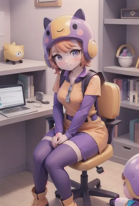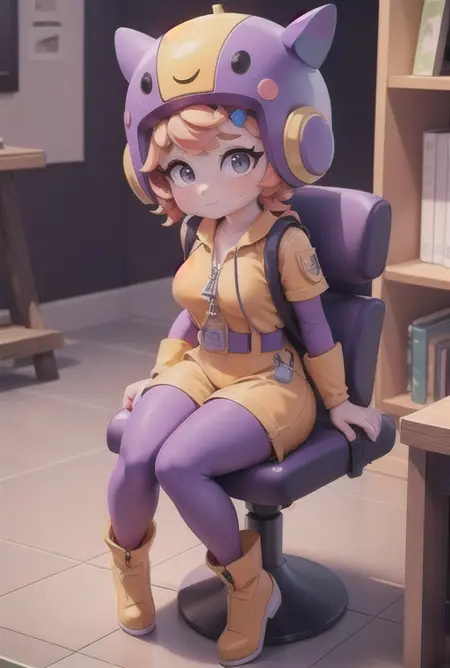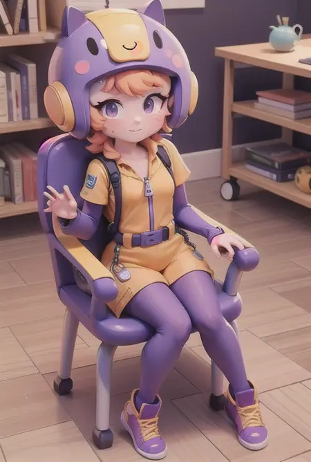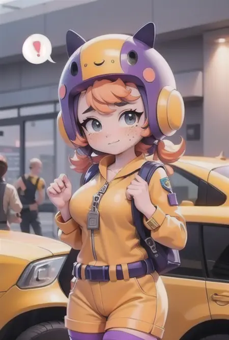 bsbea , yellow jumpsuit , shorts , Purple Long Stockings , orange hair ,zipper tab ,Freckles ,Purple sleeves, helmet