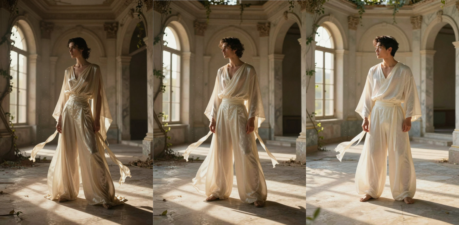 サンプル画像の重みは、右側(カジュアル)が-3.0、中央が0.0、左側(ハイエンドファッション)が4.0です。