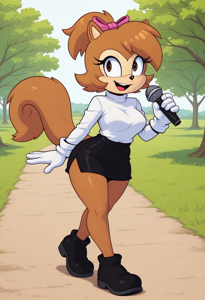 Sally the Squirrel, brown fur, brown eyes, pink ribbon on head, brown tail, white shirt, black skirt, white gloves, black shoes