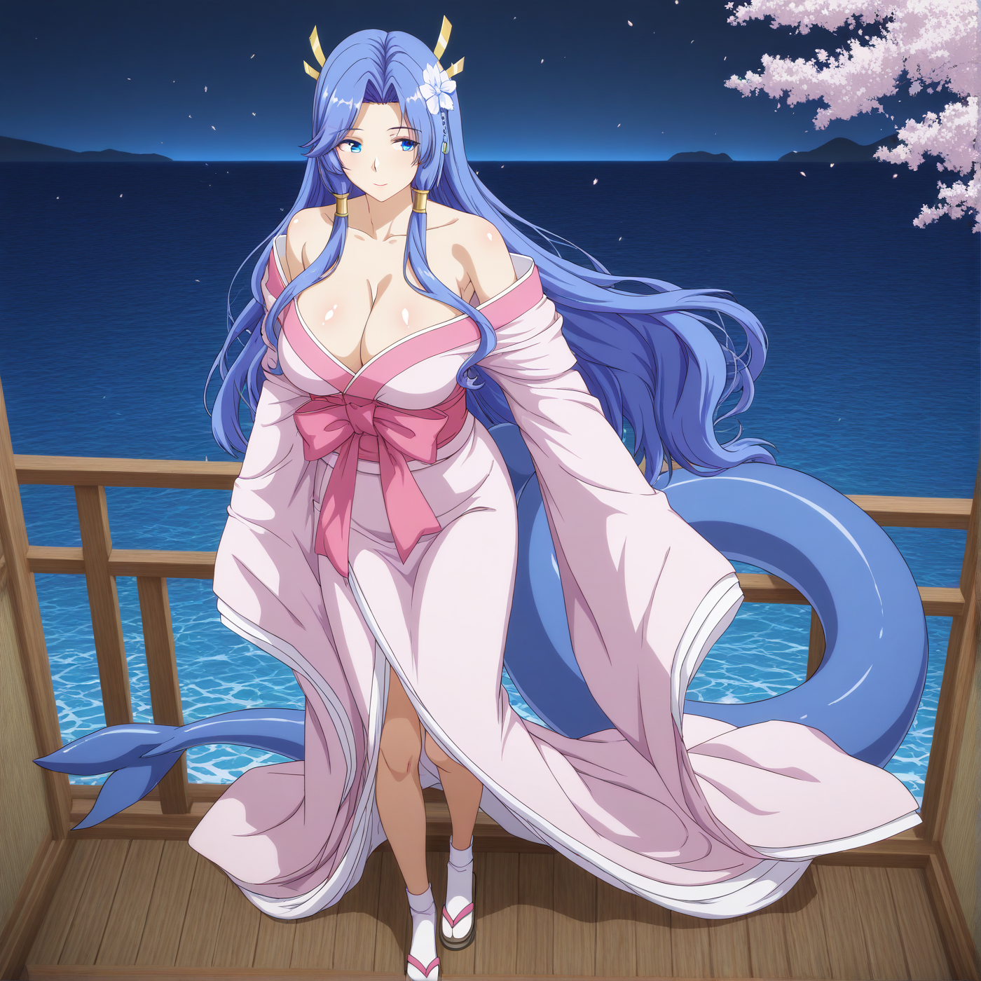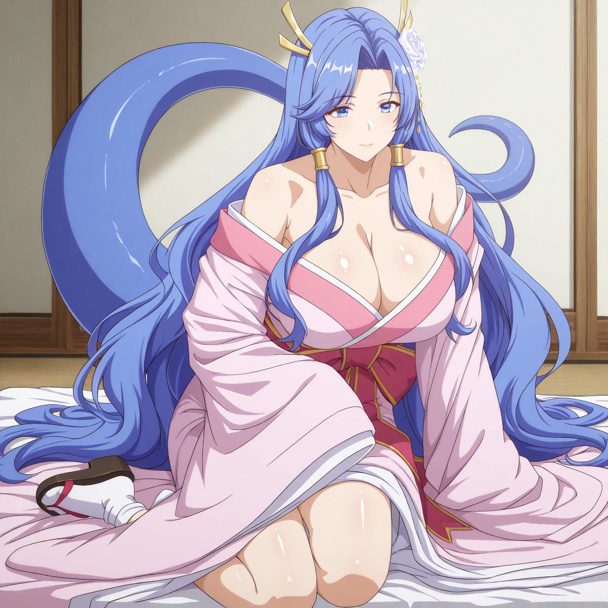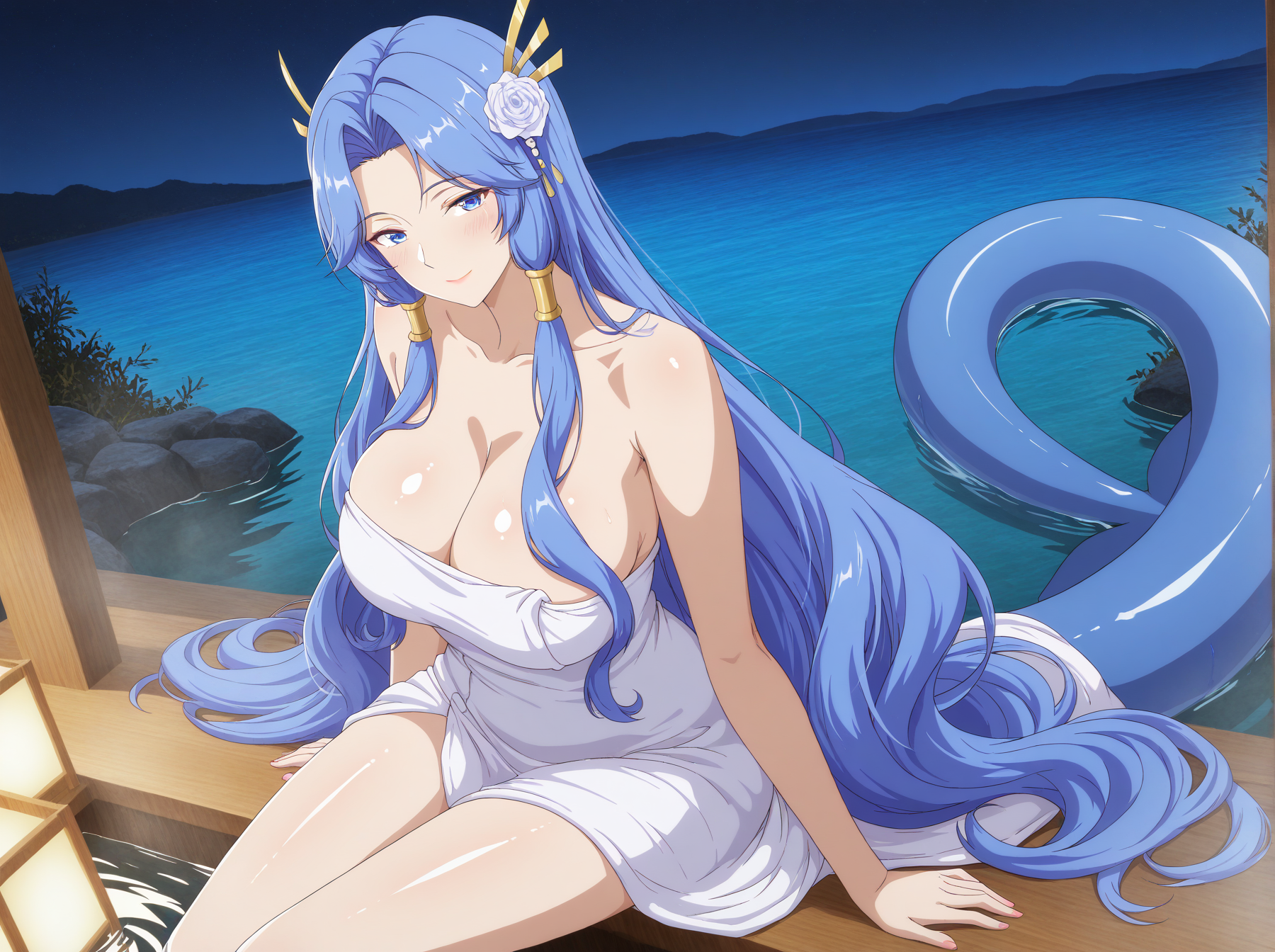 캐릭터: (ExcelRealist, 성숙한 여성, 파란 눈, 파란 머리, 매우 긴 머리, 측면 머리카락, 머리 장식, 바다 뱀 꼬리)