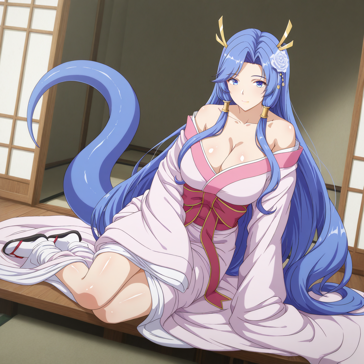 옷: (어깨를 드러낸 키모노, 가슴 노출, 큰 가슴, 넓은 소매, 소매가 손가락을 넘음, 흰 양말, 샌들)