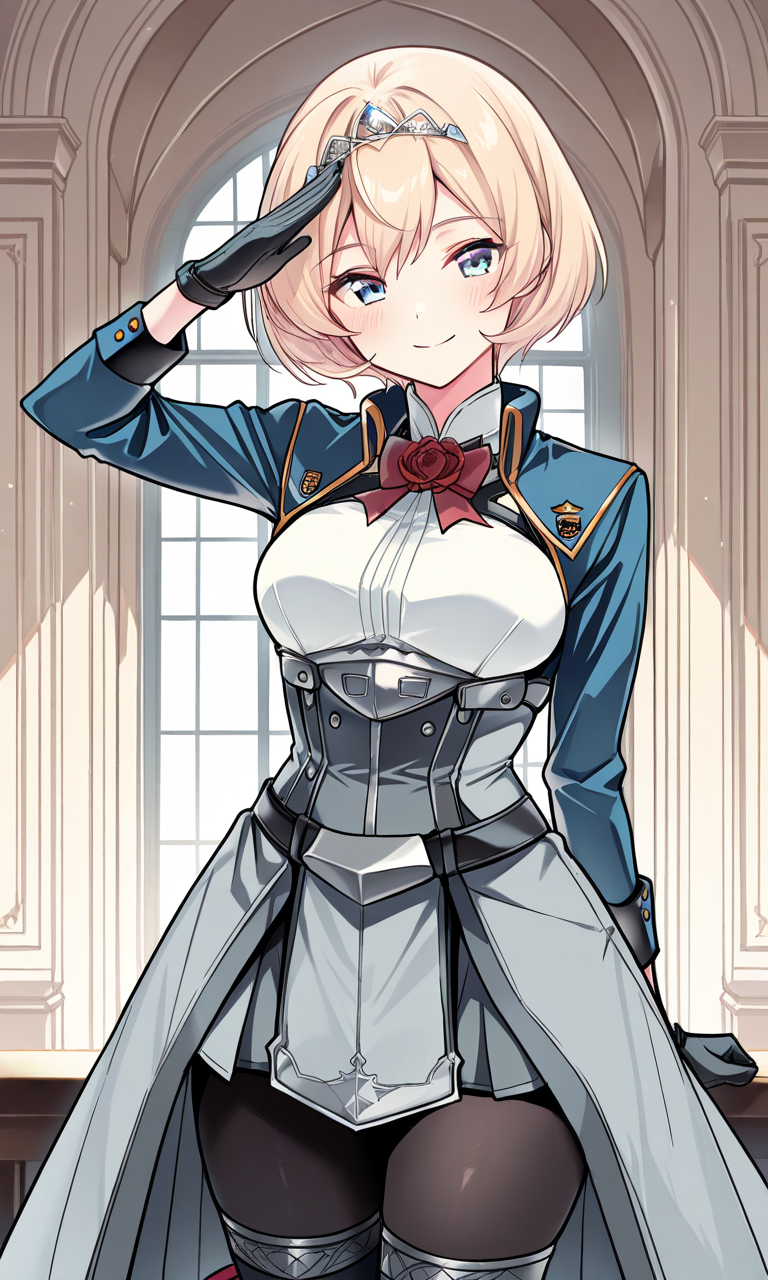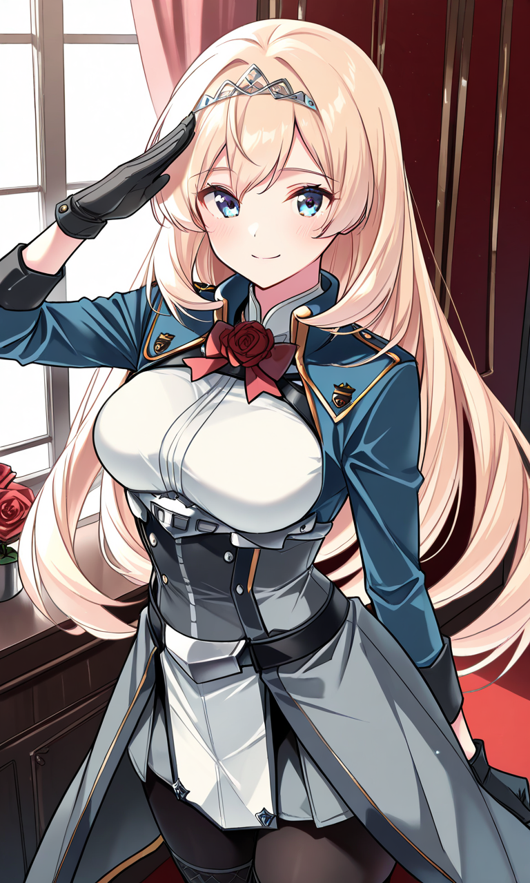 기본 복장: victoriousKC, 파란 눈, 금발, 긴 머리, 긴 소매, 허벅지 길이 양말, 재킷, 검은 장갑, 빨간 리본, 검은 팬티스타킹, 군복, 왕관, 코르셋, 단정한 재킷, 빨간 장미, 회색 아우터스커트,