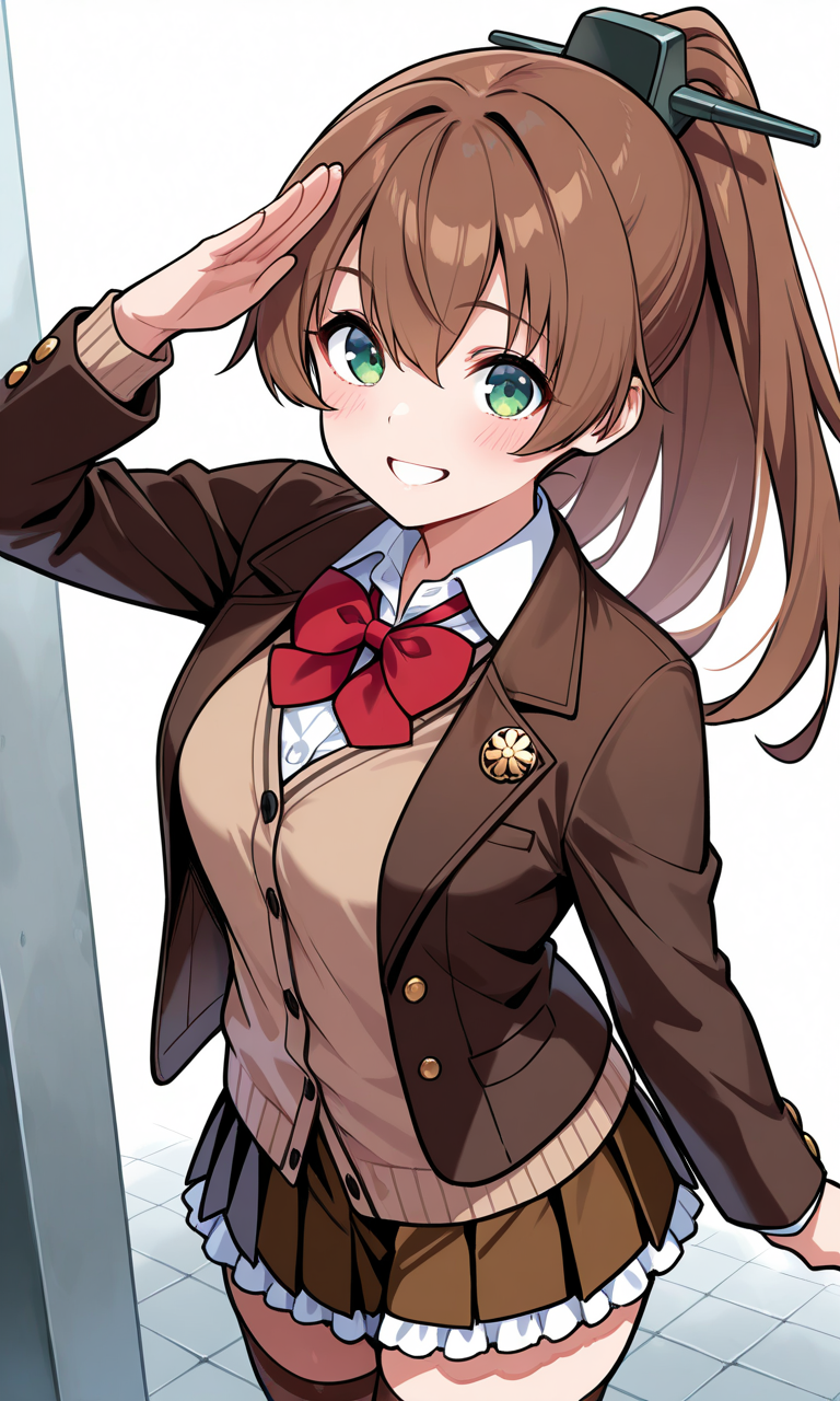 海音装: kumanokainiKC、茶色の髪、緑の目、長い髪、長袖、髪飾り、リボン、ジャケット、頭飾り、白いシャツ、ポニーテール、プリーツスカート、カッターシャツ、ボウタイ、赤いリボン、茶色のカーディガン、フリルスカート、ブレザー、赤いボウタイ、茶色のジャケット、茶色のスカート、茶色のタイツ