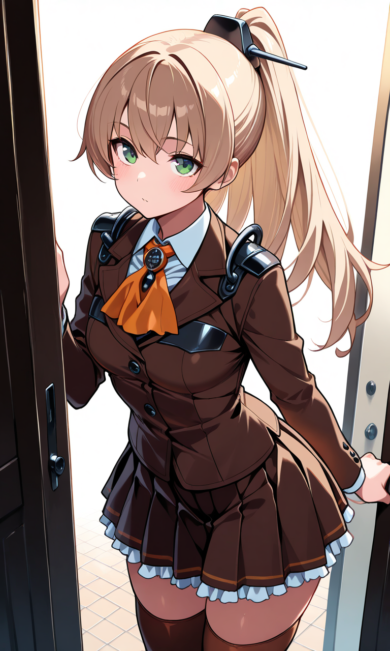改音装: kumanokaiKC、緑の目、長い髪、シャツ、長袖、髪飾り、ポニーテール、プリーツスカート、フリルスカート、茶色のジャケット、茶色のスカート、オレンジのアスコット、茶色のタイツ