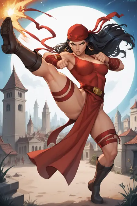 触发词:1girl, 黑发, 单人, 乳房, 武器, 头巾, 持有, 剑, 妆容, 大乳房, 双持, 饰品, 耳环, 手套, 靴子, 忍者, 红色紧身衣