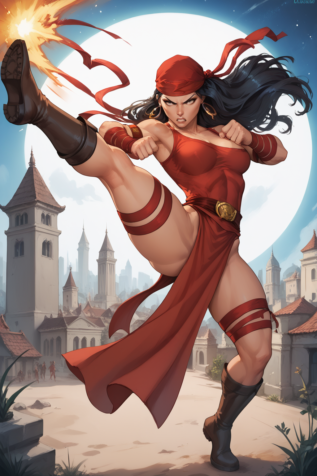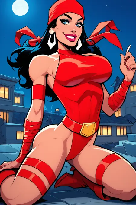 Trigger: 1girl, black hair, solo, breasts, weapon, bandana, holding, sword, makeup, large breasts, dual wielding, jewelry, earrings, gloves, boots, ninja, red leotard