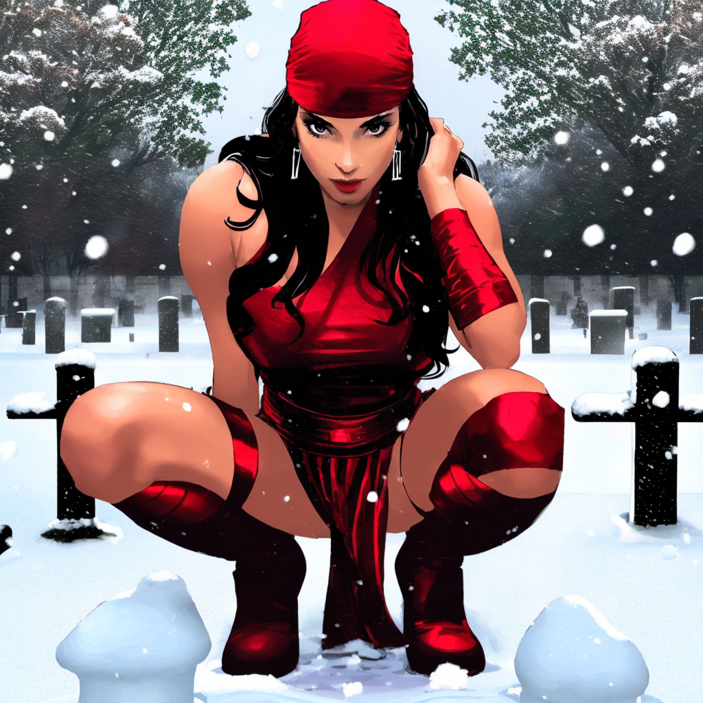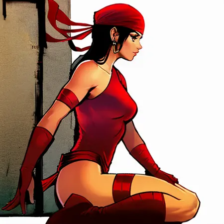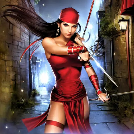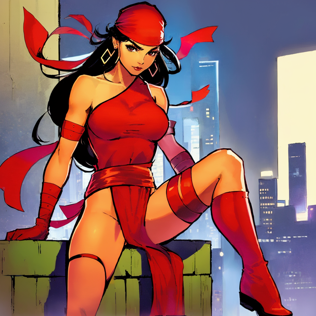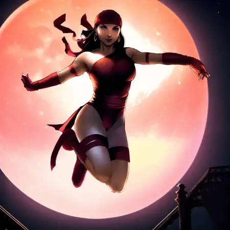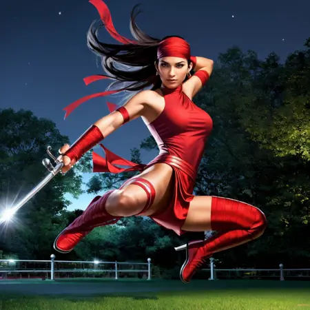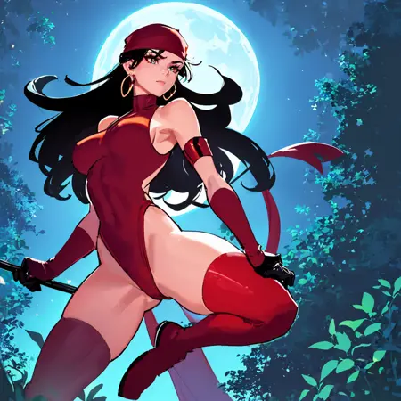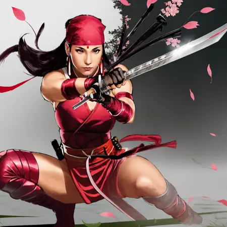 触发词:1girl, 黑发, 单人, 乳房, 武器, 头巾, 持有, 剑, 妆容, 大乳房, 双持, 饰品, 耳环, 手套, 靴子, 忍者, 红色紧身衣