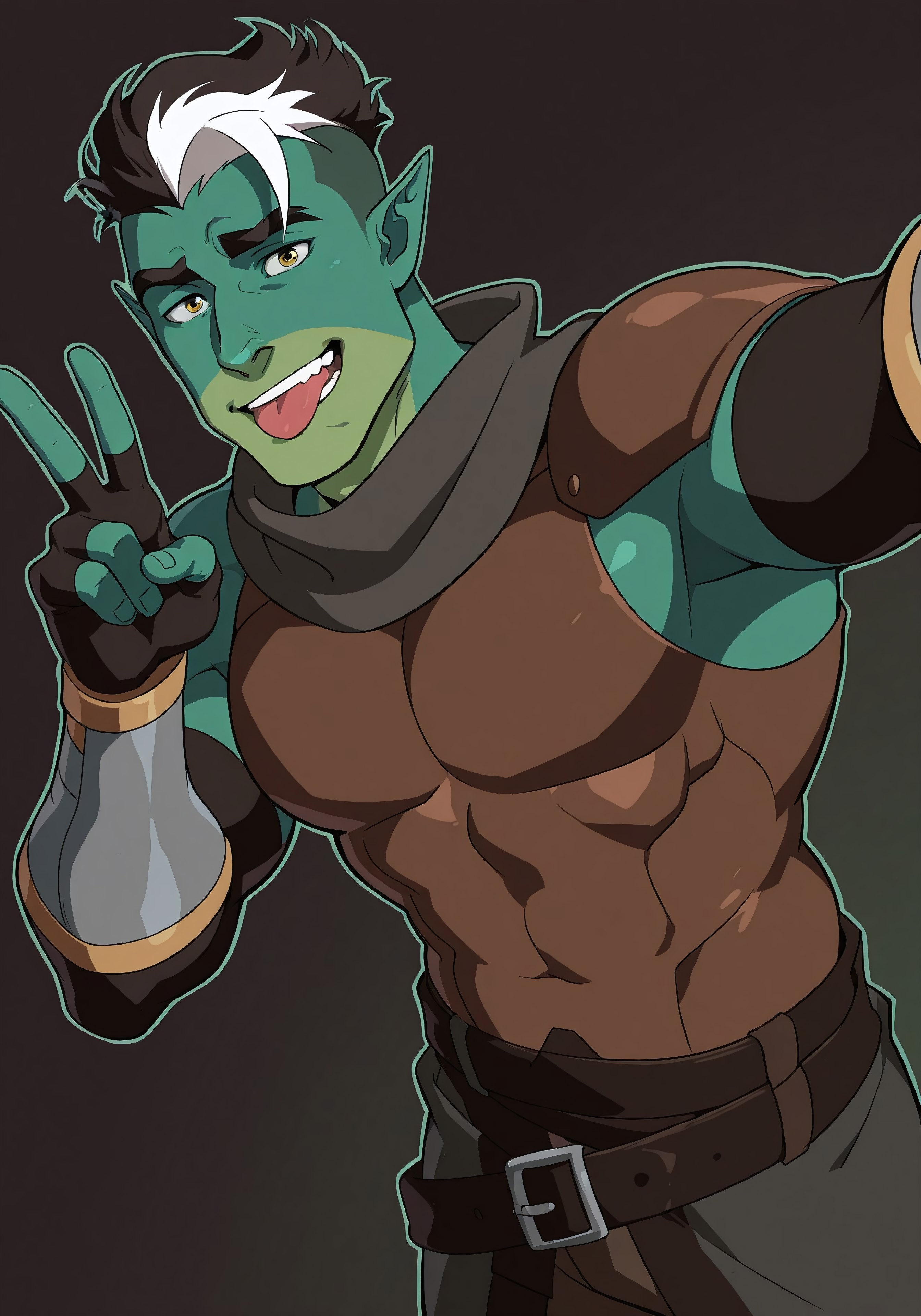 | 학습된 단어 | fj0rd, green skin, two-tone green skin, pointy ears, yellow eyes, undercut, spiky black hair, white hair-streak,복사됨! sleeveless brown leather chest armor, dark gray scarf, single shoulder leather armor, forearm bracers, leather fingerless gloves, long gloves, wide belt with metal buckle, grey and black waistcloth, brown pants, knee-high leather boots,복사됨! |