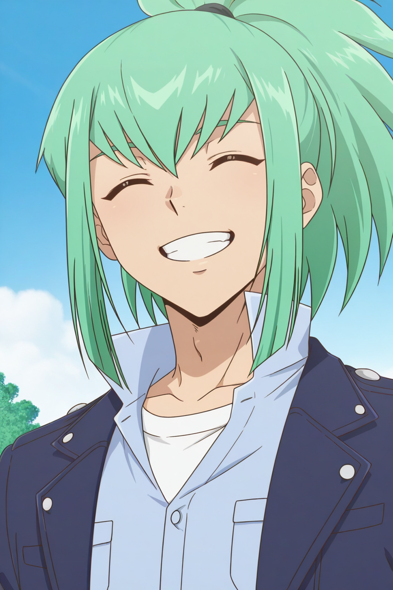 1boy, leo5dsadult, male focus, solo, yellow eyes, downy green hair, ponytail, sidelocks, hair between eyes, dark blue jacket, open jacket, light blue buttoned shirt, white undershirt, black gloves, dark grey pants, dark brown and black boots,