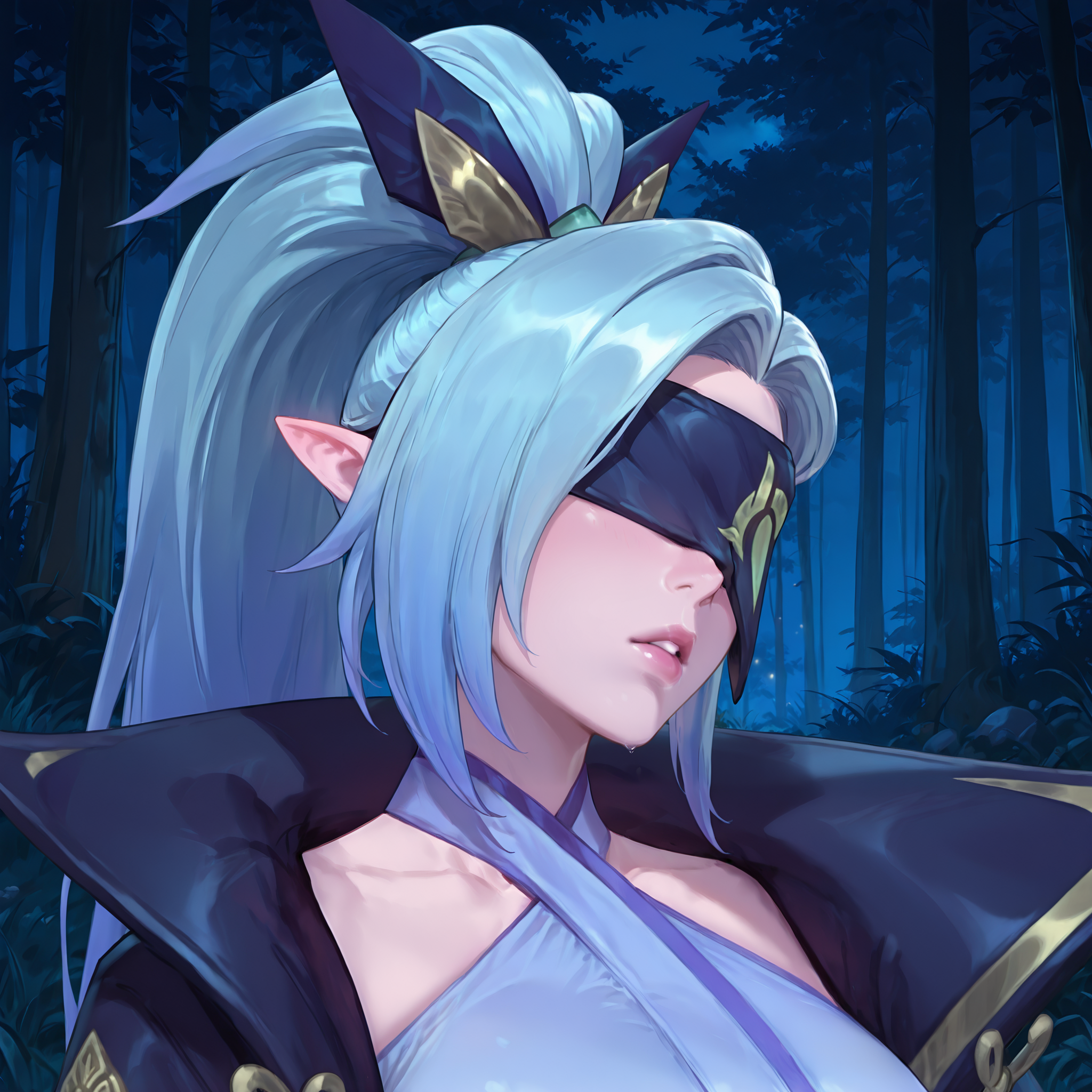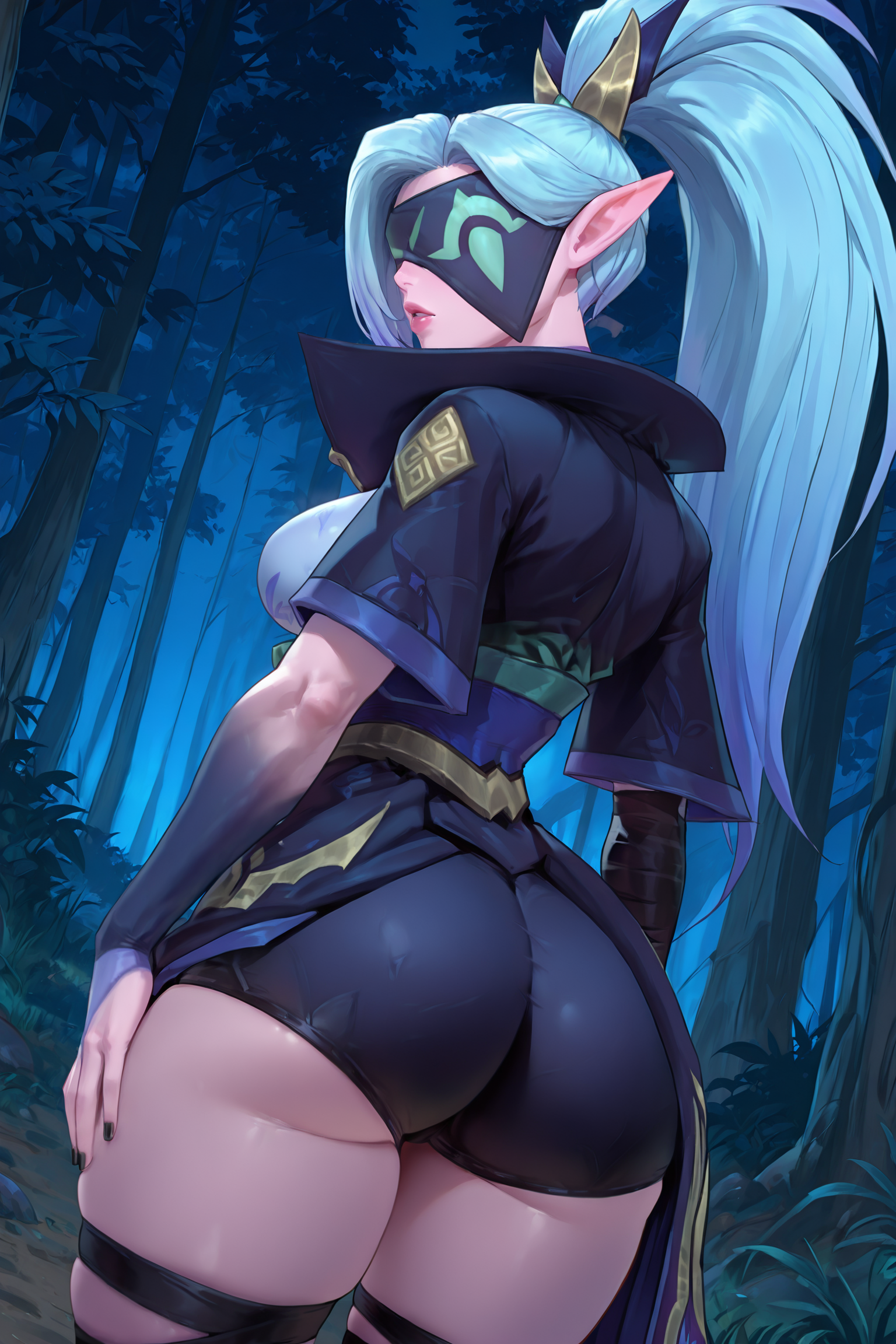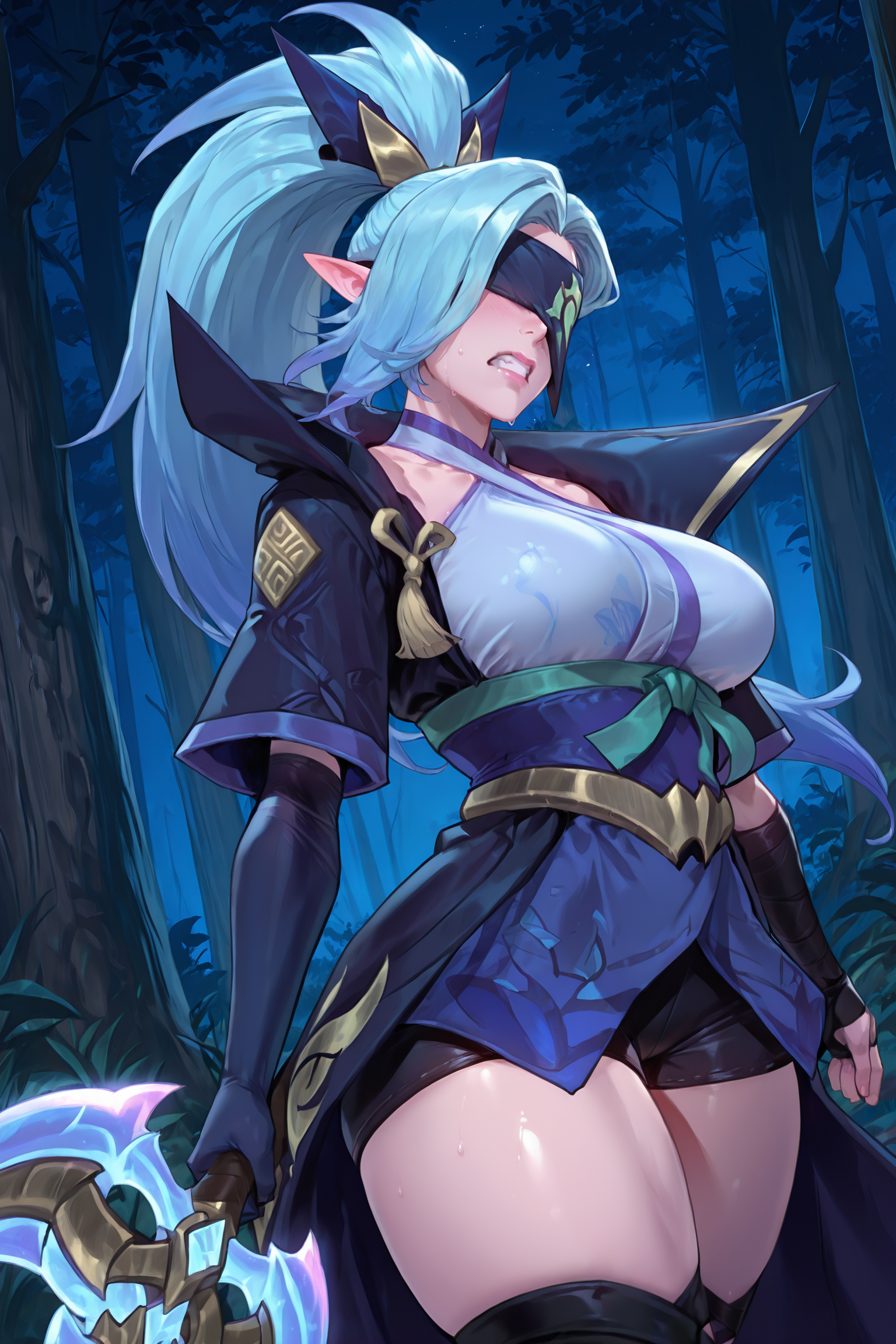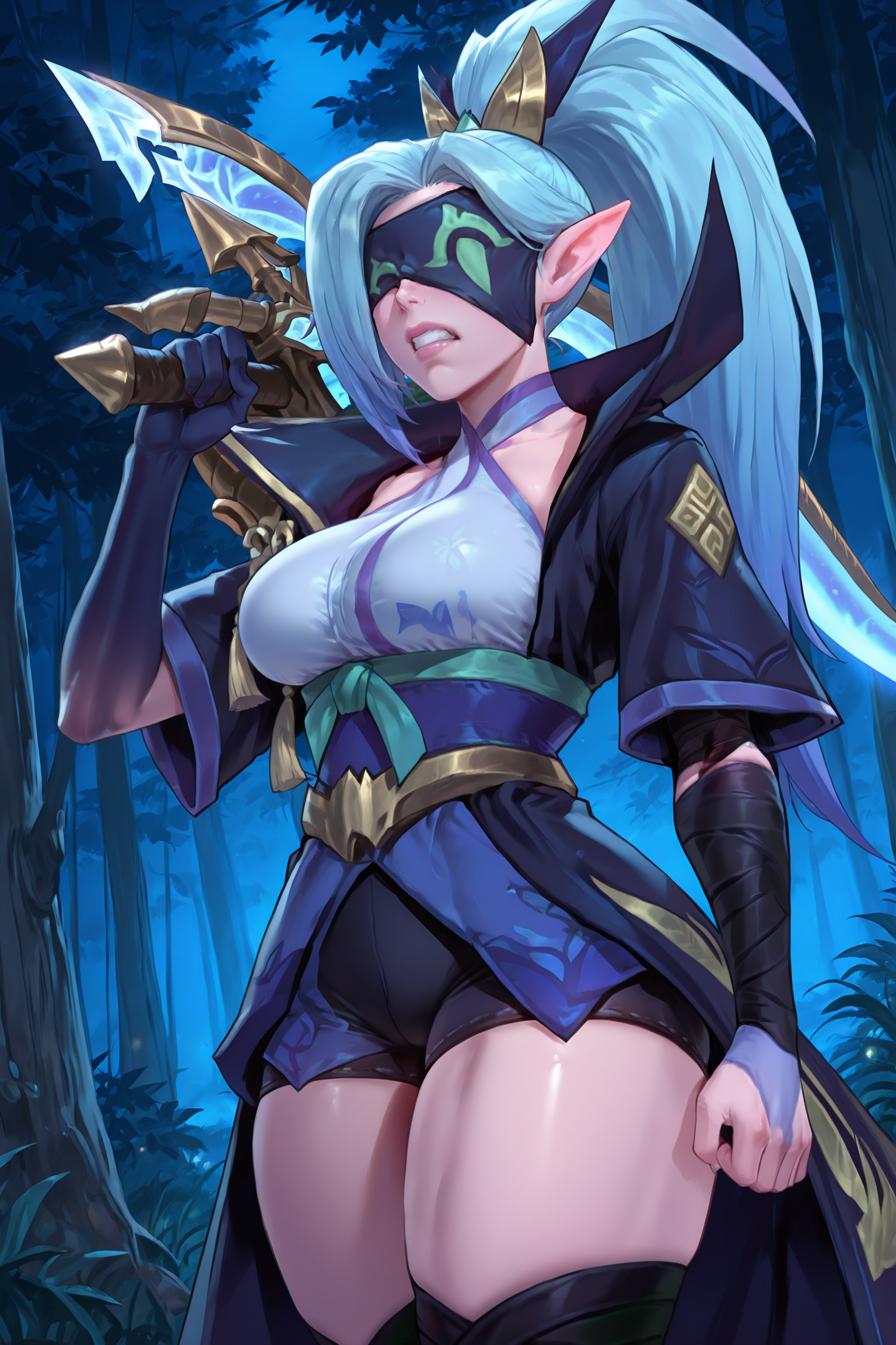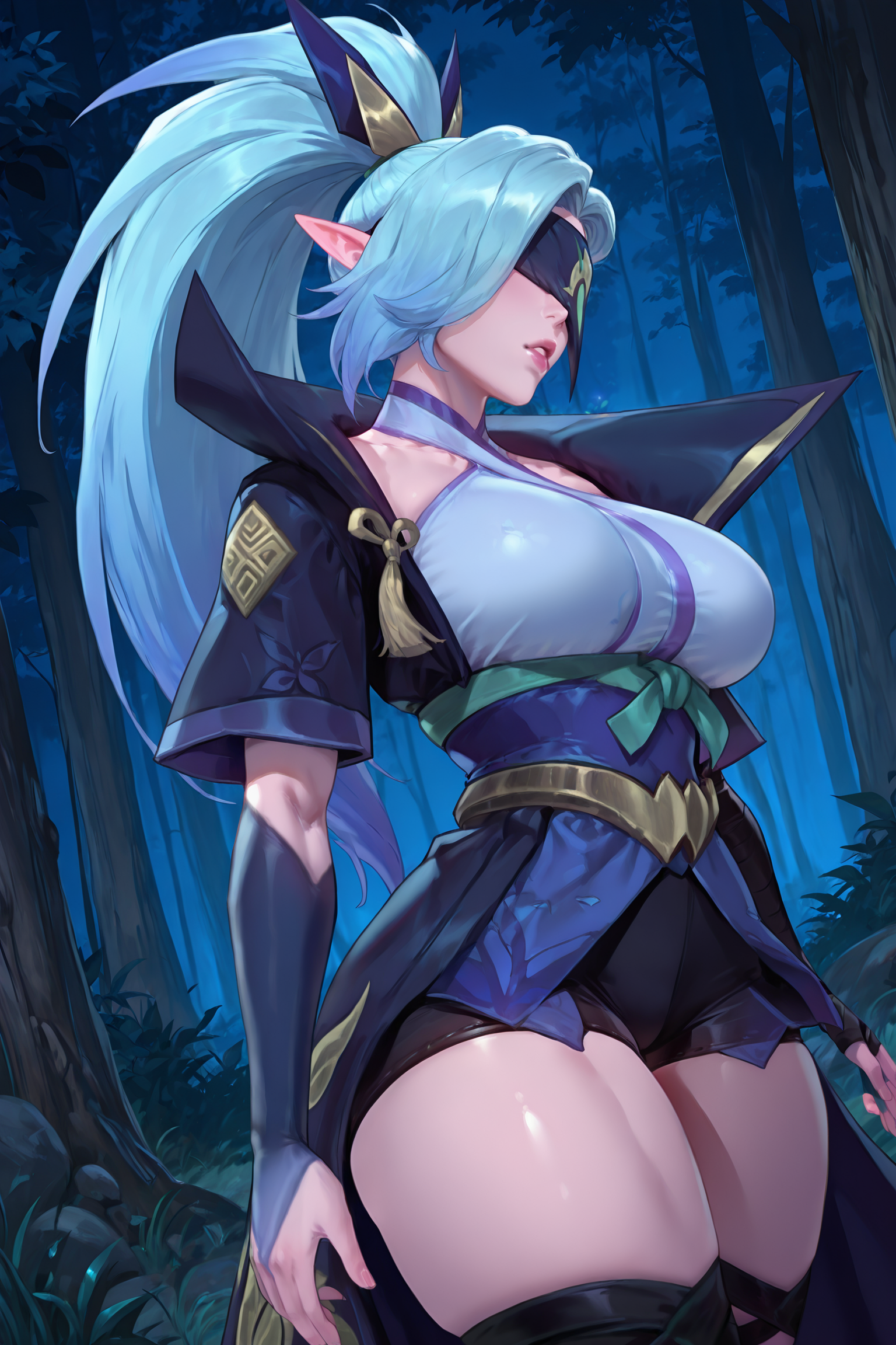 spiritblossomvayne、長い髪、前髪、青い髪、ポニーテール、髪飾り、とがった耳、目隠し、マスク、大きな胸、和服、肩出し、手袋、太ももまでの靴下、つま先なしのレッグウェア、つま先の爪、つま先のネイルポリッシュ