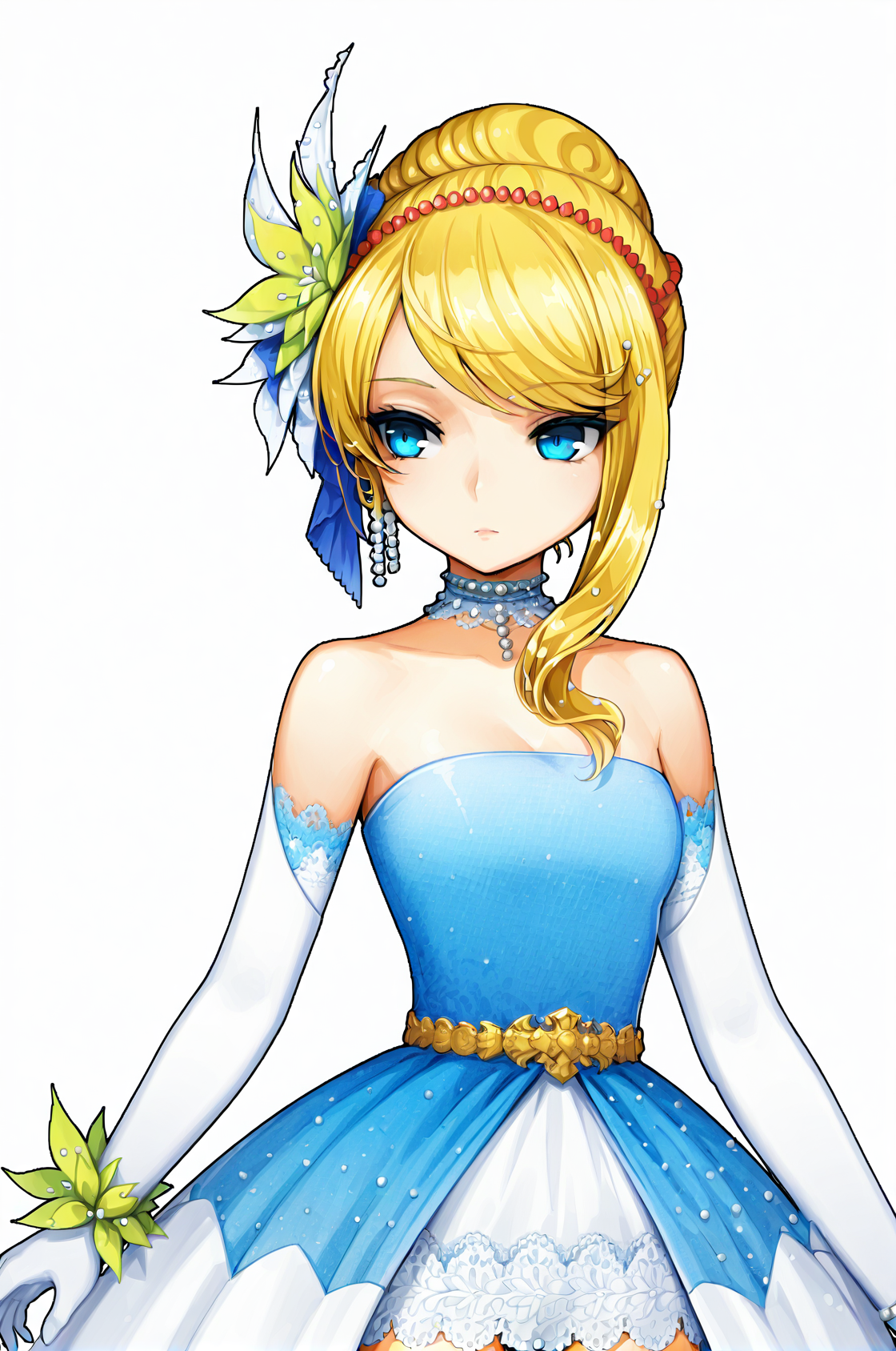ユニフォーム:チョーカー、肘まで手袋、ジュエリー、肩出し、ストラップレス、袖なし、ブレスレット、真珠のネックレス、レース縁取り、長い青いドレス、白いスカート、白い太ももハイ、赤い靴