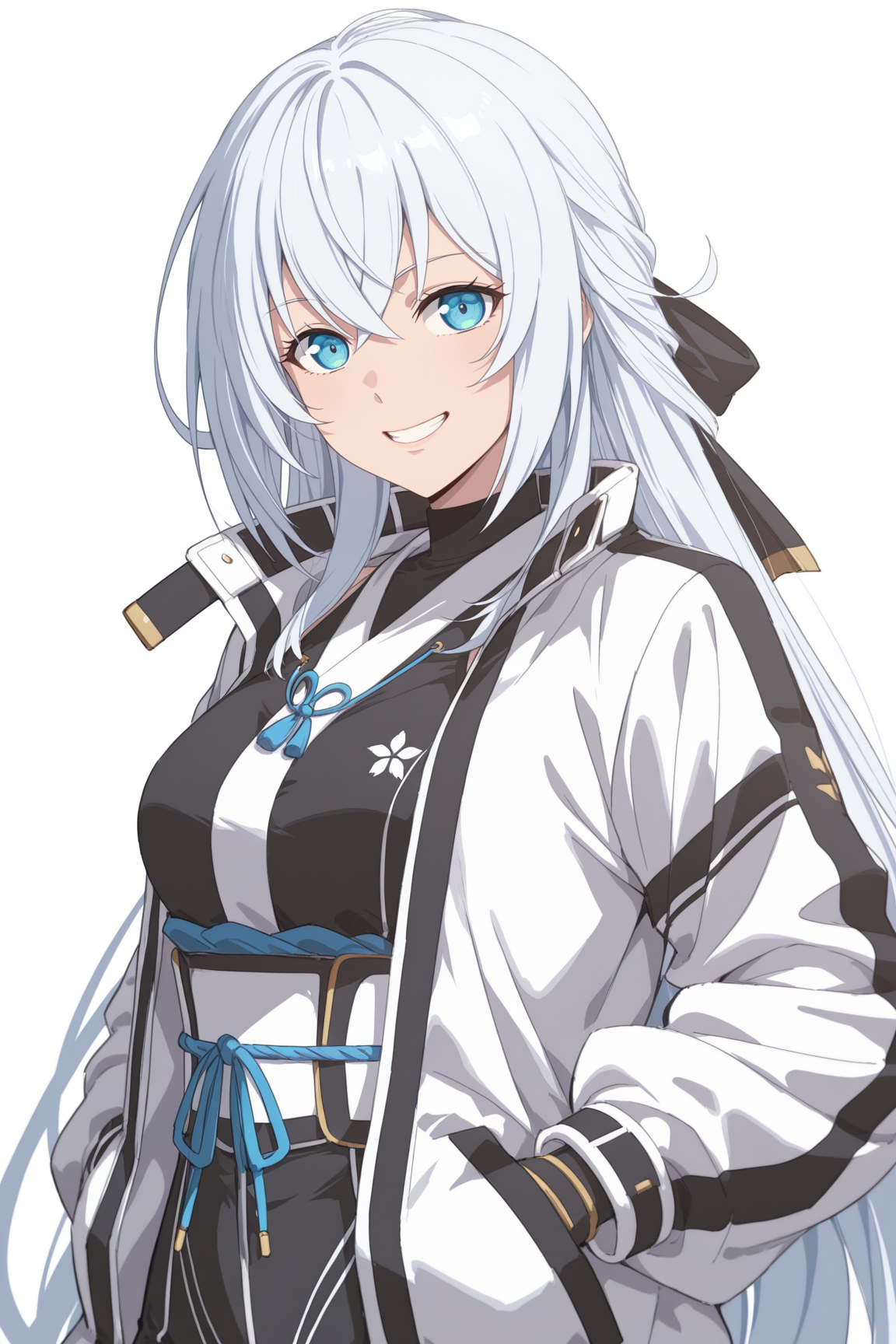 KuroUniform、black_bodysuit、white_jacket、striped_jacket、open_jacket、white_sash、black_gloves、fingerless_gloves、hip_vent、