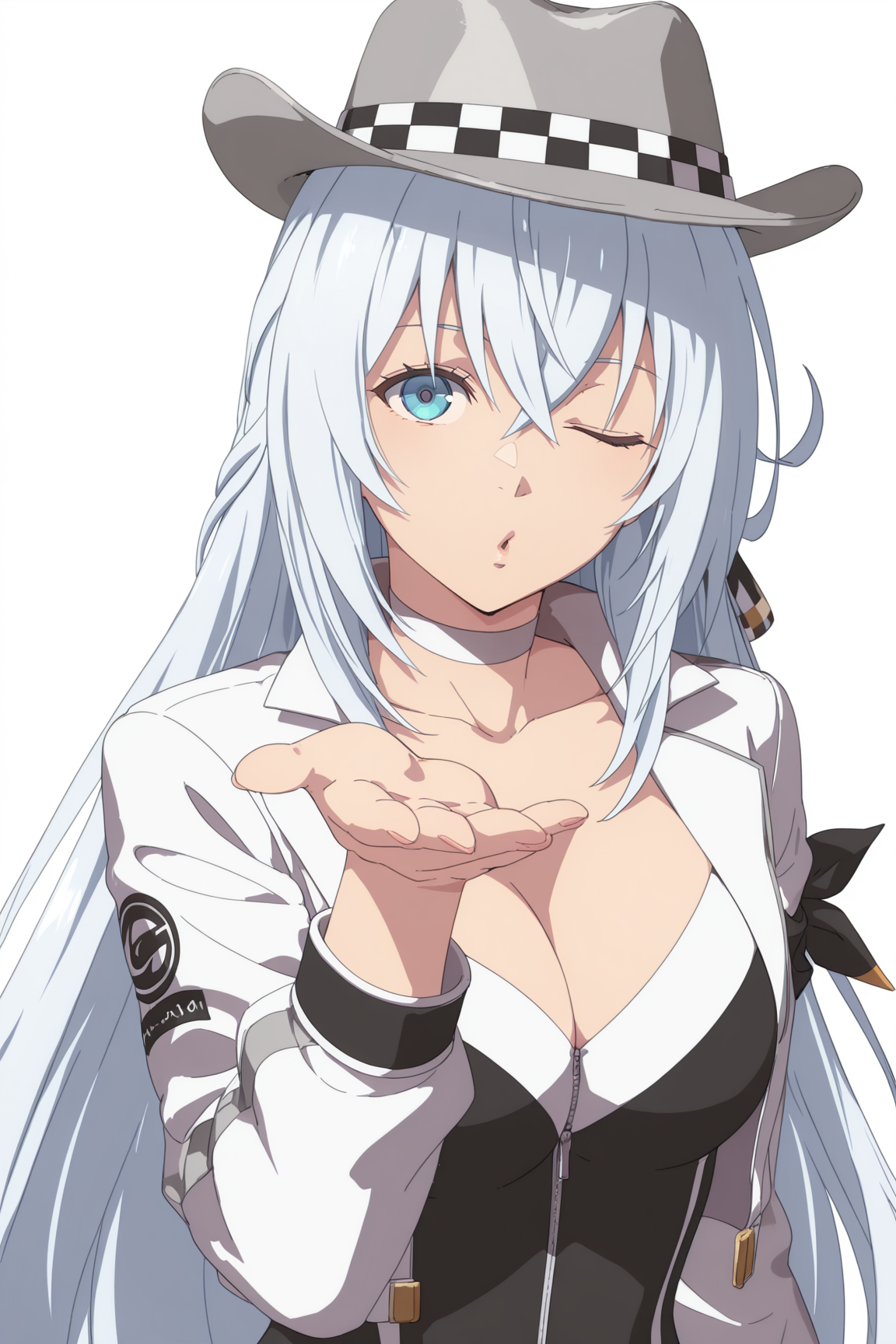racequeen02、white_choker、cowboy_hat、grey_headwear、white_jacket、cropped_jacket、black_leotard、cleavage、collarbone、full-length_zipper、grey_thighhighs、black_armband、