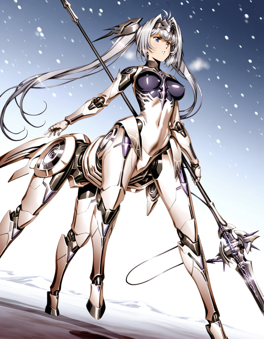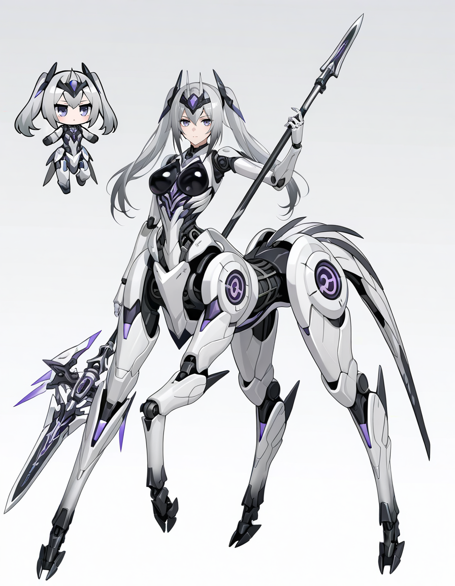 mai_pgrrosettajf,centauroid,mature_female,(aged_ip:1.5),medium_hair,long_sidelocks,twintails,grey_hair,medium_breasts,headgear,android,robot_joints,mechanical_parts,holding_polearm