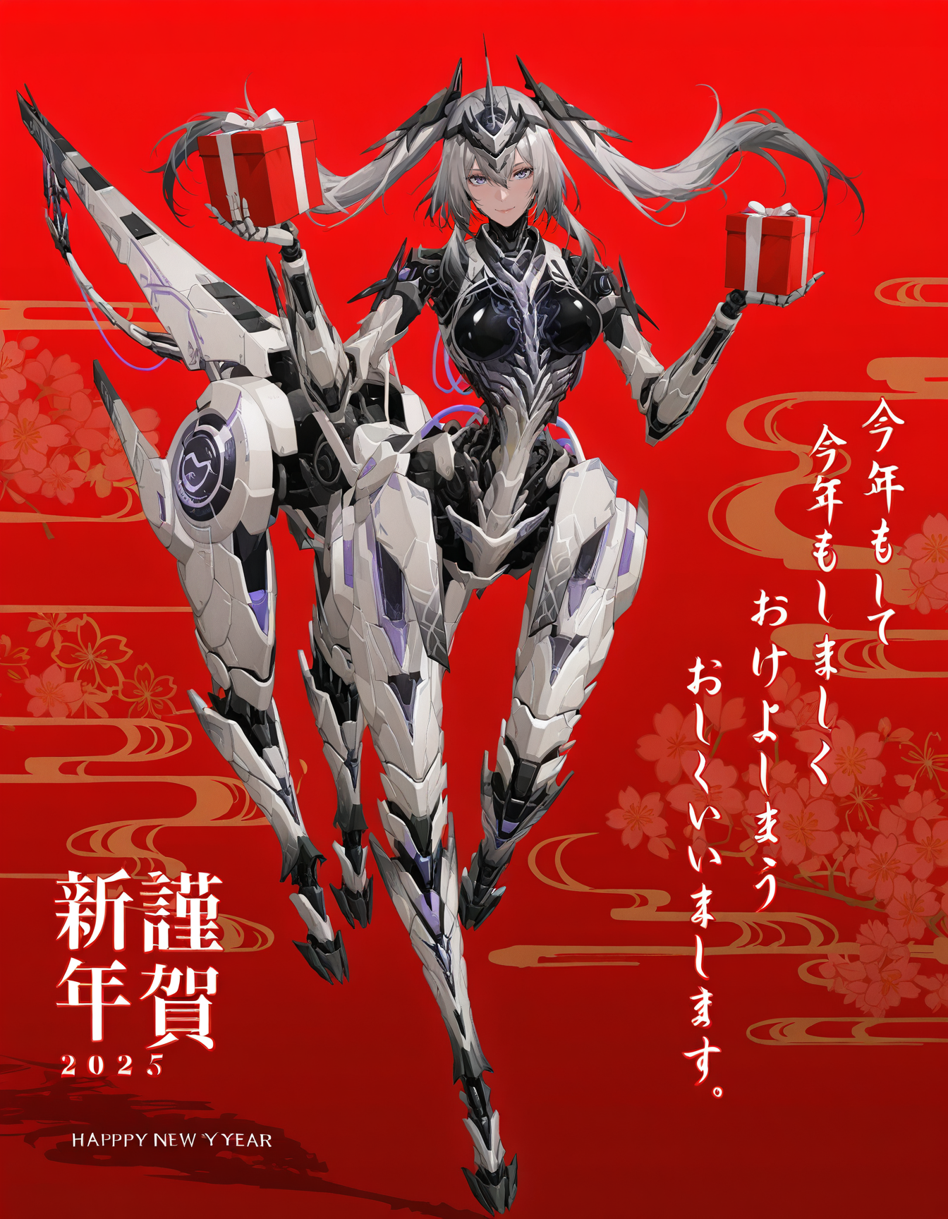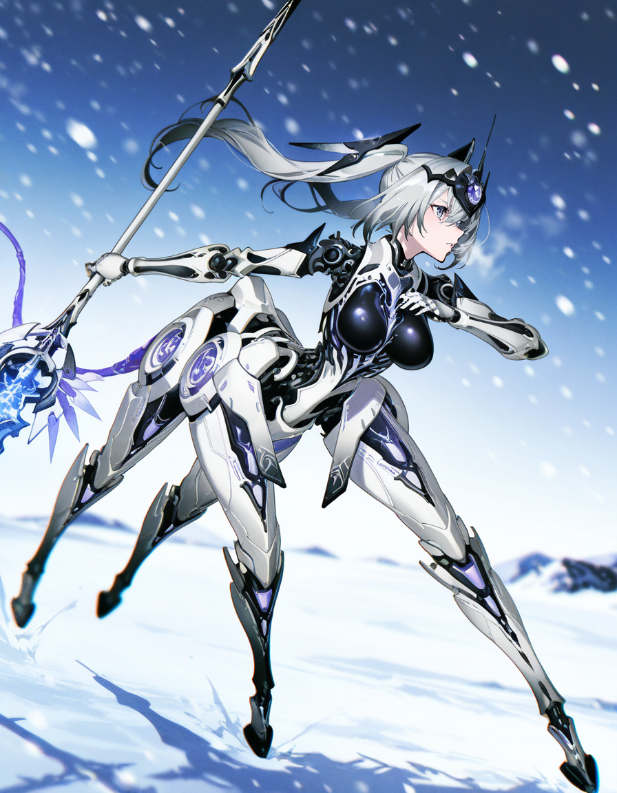 mai_pgrrosettajf,mature female,(aged_up:1.5),medium_hair,twintails,grey_hair,purple_eyes,medium_breasts,headgear,bodysuit,cyborg,mechanical_parts,mechanical_arms,mechanical_legs,wings,jetpack, holding_polearm