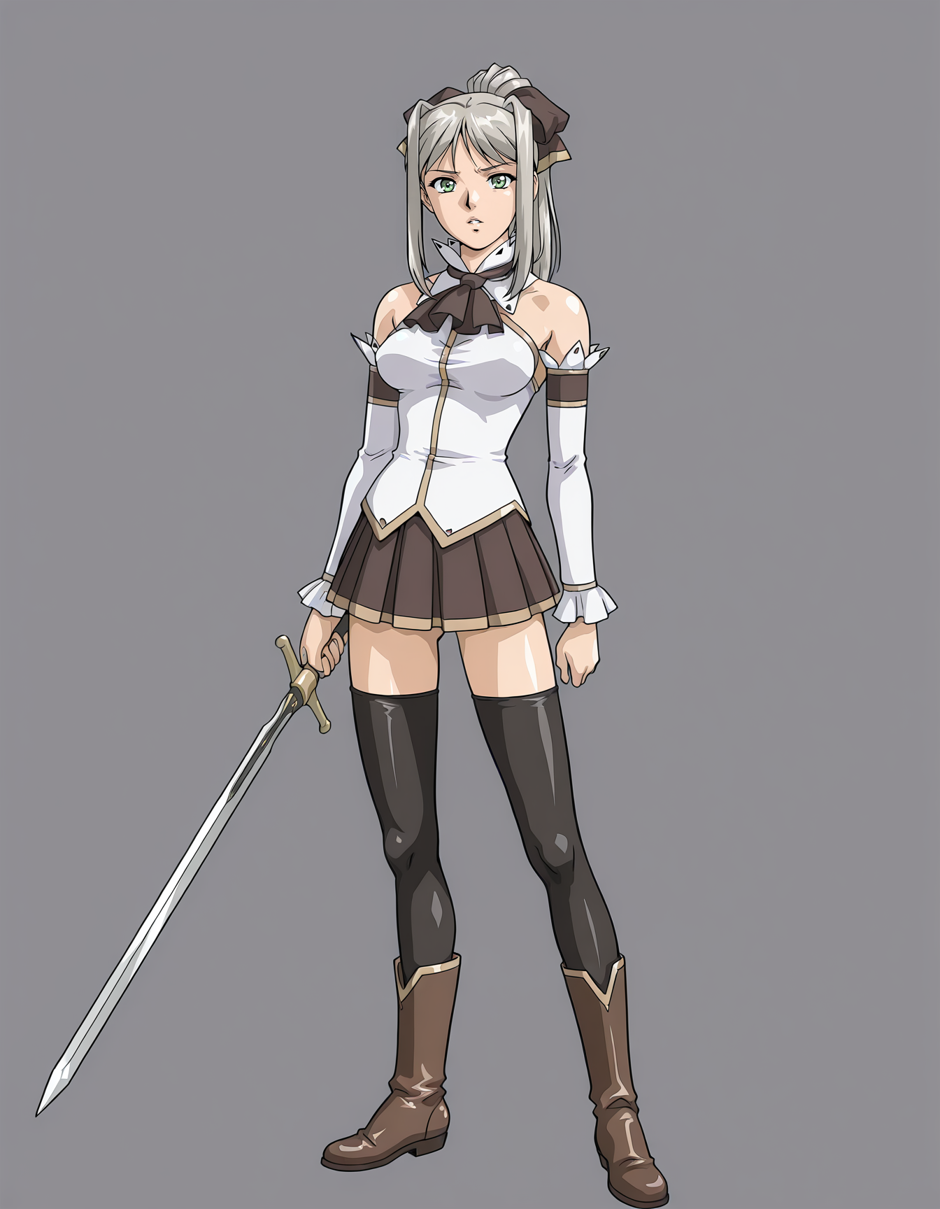 mai_liliapk,long_hair,ponytail,grey_hair,green_eyes,hair_bow,ascot,white_shirt,bare_shoulders,detached_sleeves,pleated_skirt,miniskirt,black_thighhighs,boots,holding_sword