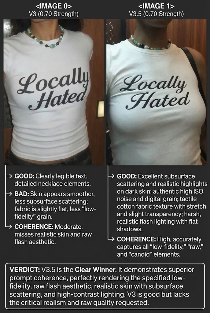 このLoRAは、Z-Image-Turboに生の質感、現実的な肌の詳細(毛孔・細毛)、そして自然な光の物理法則を追加します。AI特有の「プラスチックのような」外観を除去することを目的としており、カジュアルな「カメラロール」スナップショットに効果的です。また、一般的なリアリズム向上のために、高品質なプロフェッショナルな撮影にもある程度適用できます。