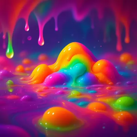 rainbow slime, multicolor liquid, iridescent colors, hyper-saturated colors, glossy surface, liquid blobs, dripping fluid, viscous material, surreal 3d style, smooth organic shapes, melting forms, fluid simulation look, vibrant neon colors, candy-like texture, soft reflections, high gloss finish, colorful gradients, abstract liquid art, dreamlike atmosphere, playful surrealism, fantasy material, liquid sculpture, volumetric lighting, macro detail look, cinematic lighting, soft depth of field, ultra smooth shading, digital art render, stylized realism, high detail 3d