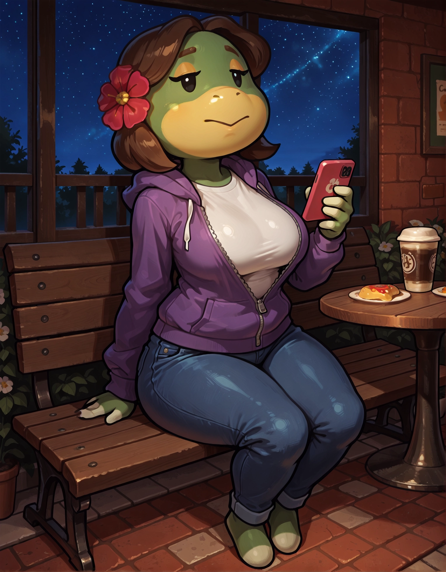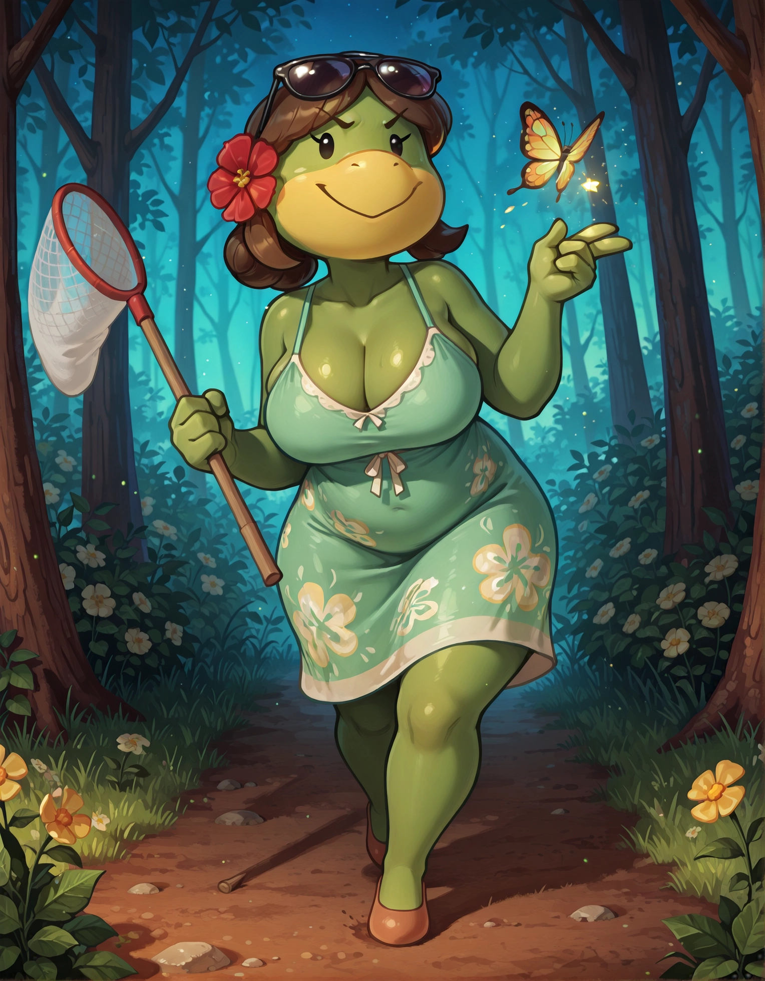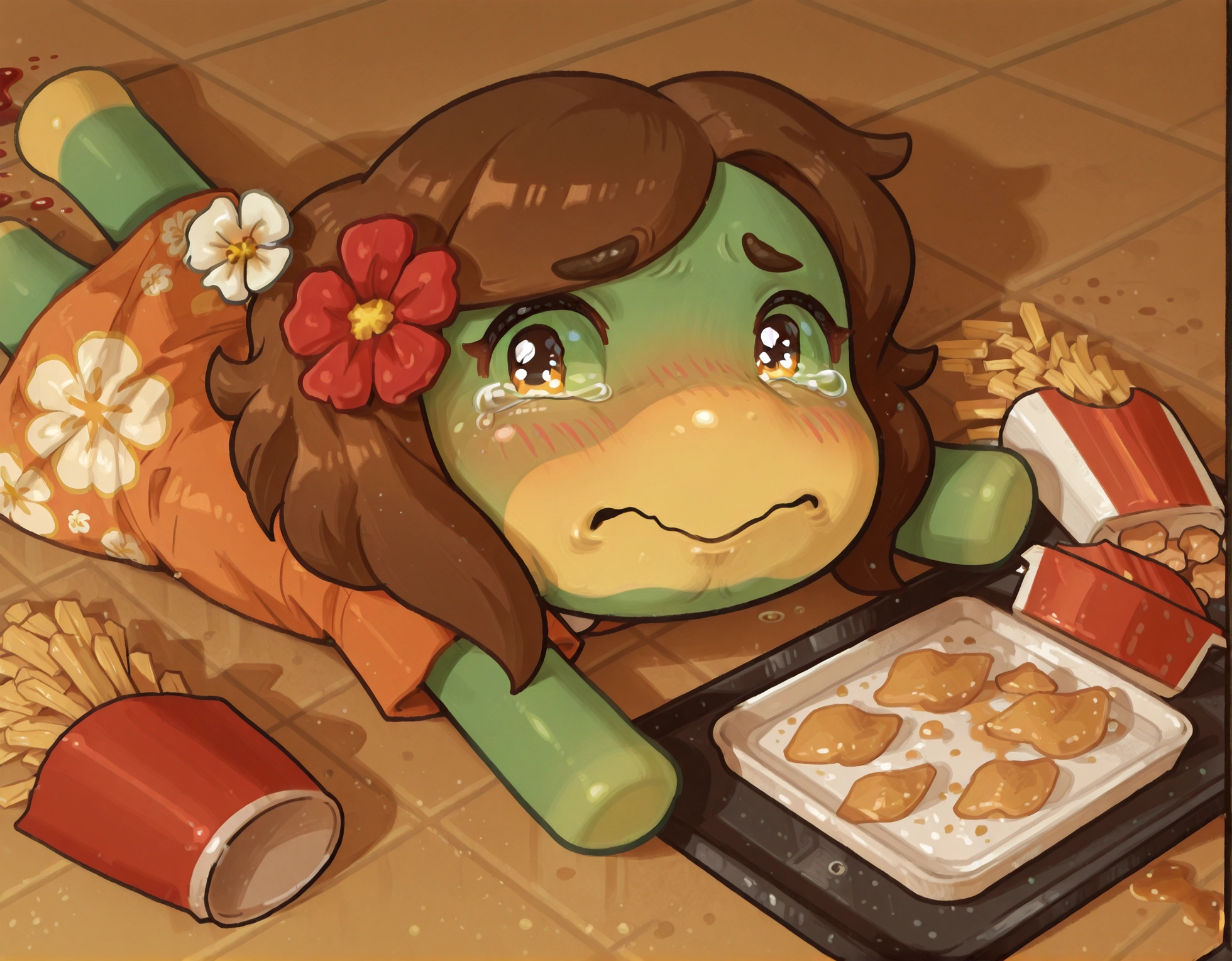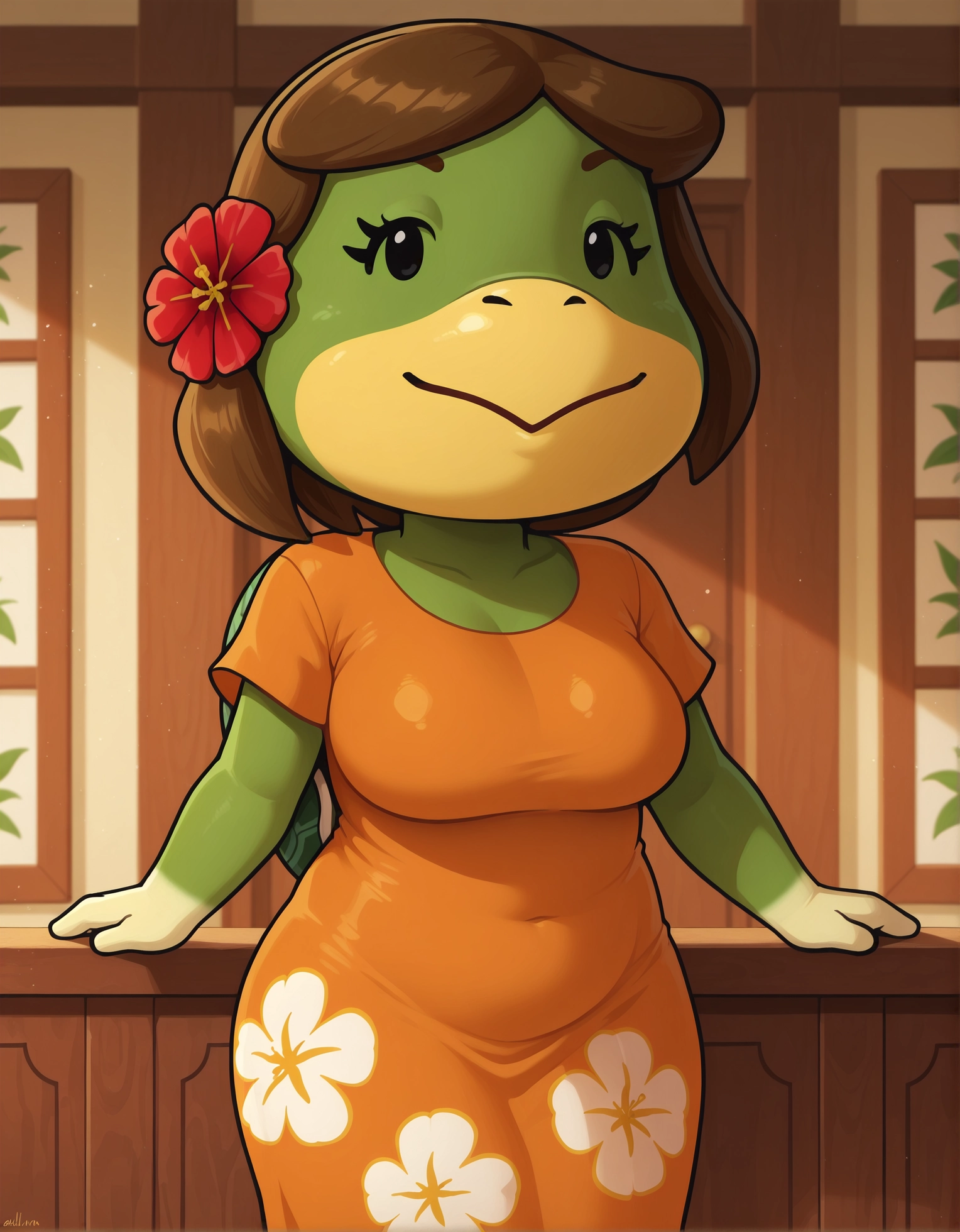 Leilani, animal crossing, chibi, ファリーな女性, 緑色の肌, 黄色い顔, 黒い目, 単純な目, 髪に花, 茶色の髪, :>,