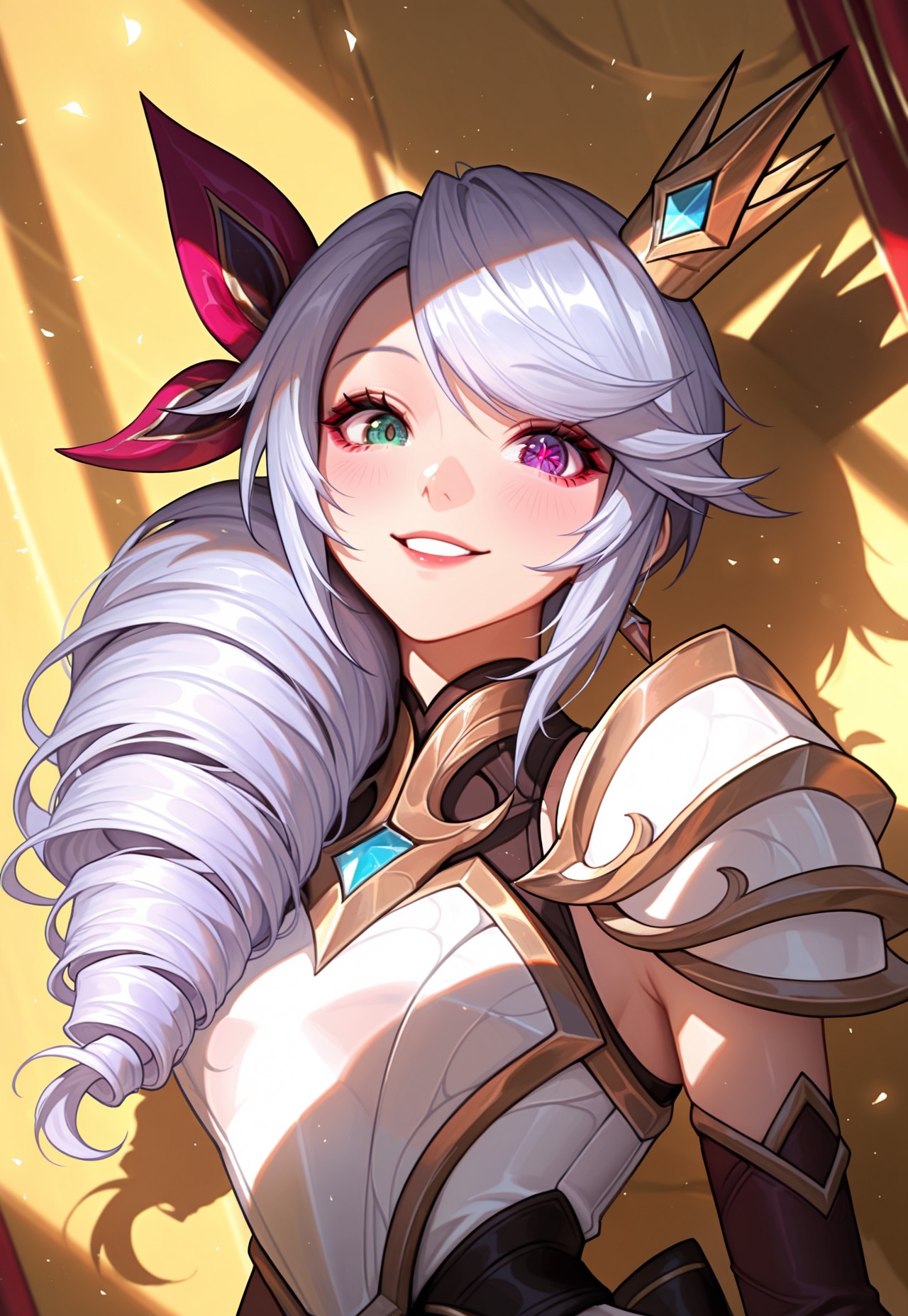 BQgwen, white hair, twindrills, drill hair, bangs, hair bow, hair ornaments, heterochromia, green eyes, purple eyes, crown, frilled dress, multicolored dress, single shoulder armor, detached sleeves, armored boots