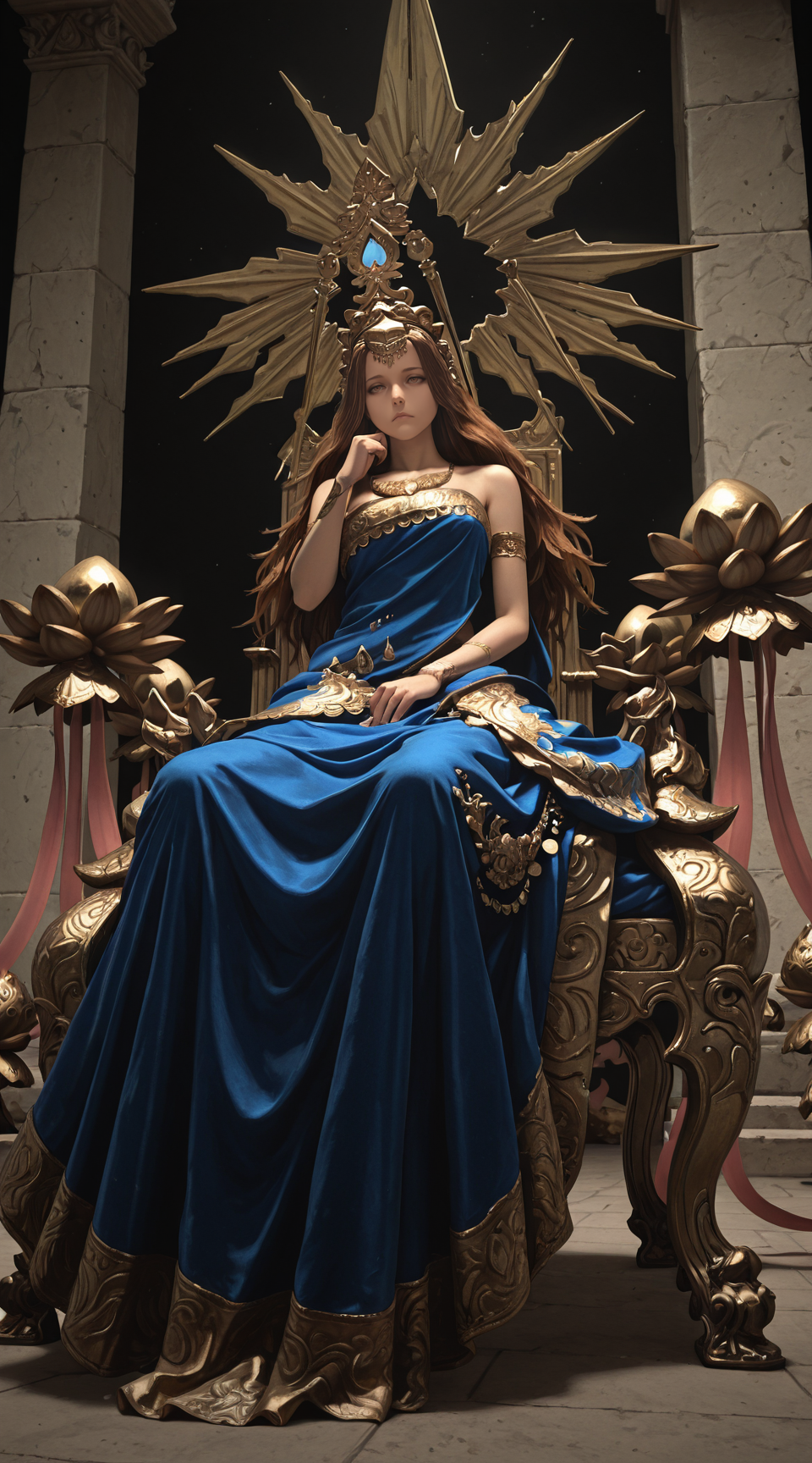 デフォルトの外見:ffxiv_lakshmi, jeweled_crown, gold_necklace, blue_dress, gold_trim, gold_armlet, pink_ribbon, lotus_pods