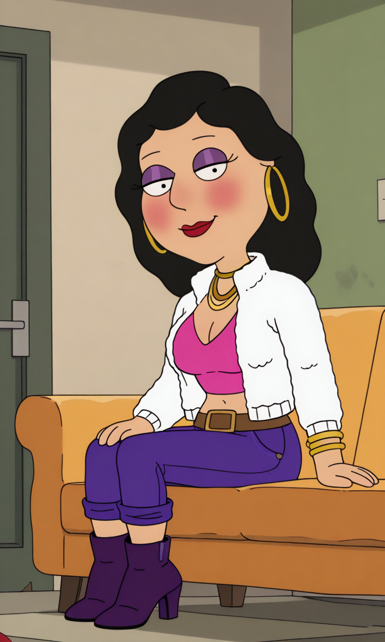 white fur jacket, open jacket, pink shirt, short sleeves, v-neck, cleavage, navel, brown belt, gold belt buckle, purple pants, pants rolled up, purple high heel boots