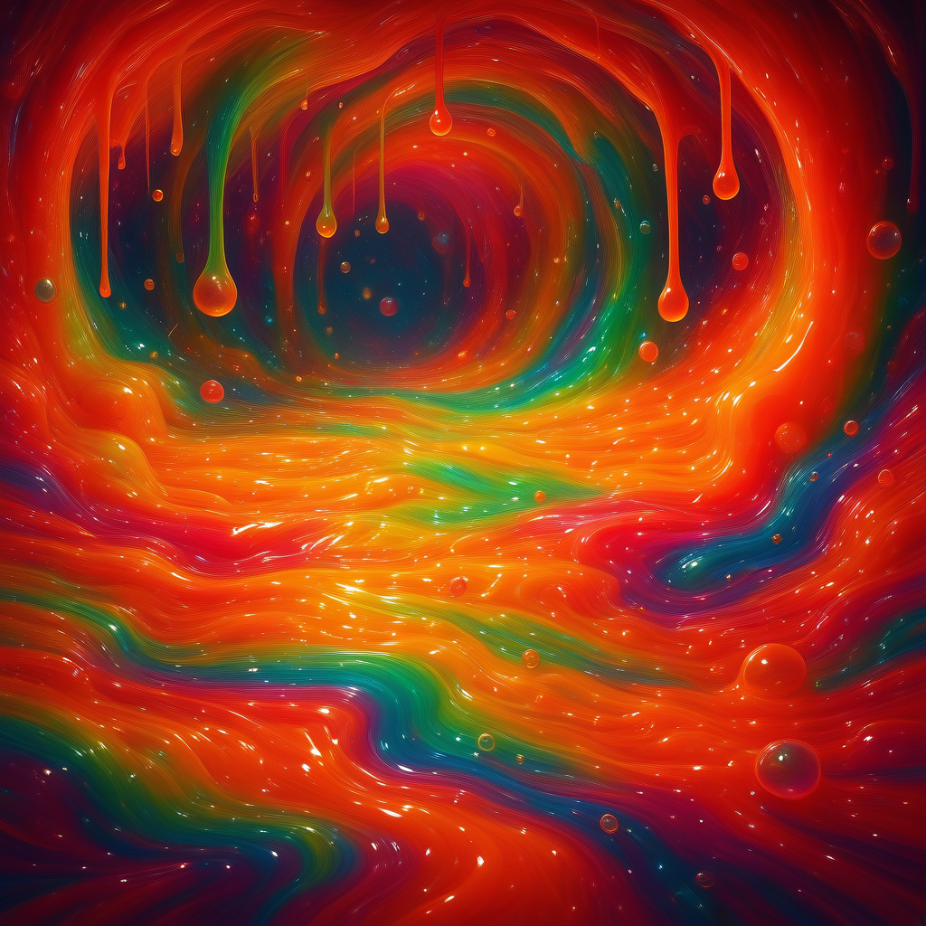 rainbow slime, multicolor liquid, iridescent colors, hyper-saturated colors, glossy surface, liquid blobs, dripping fluid, viscous material, surreal 3d style, smooth organic shapes, melting forms, fluid simulation look, vibrant neon colors, candy-like texture, soft reflections, high gloss finish, colorful gradients, abstract liquid art, dreamlike atmosphere, playful surrealism, fantasy material, liquid sculpture, volumetric lighting, macro detail look, cinematic lighting, soft depth of field, ultra smooth shading, digital art render, stylized realism, high detail 3d
