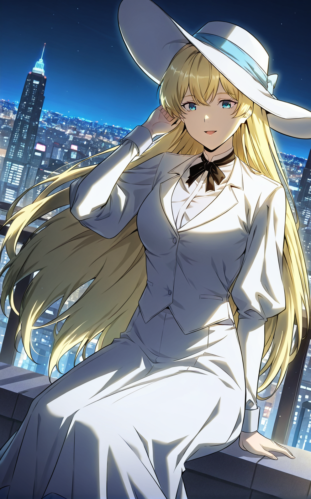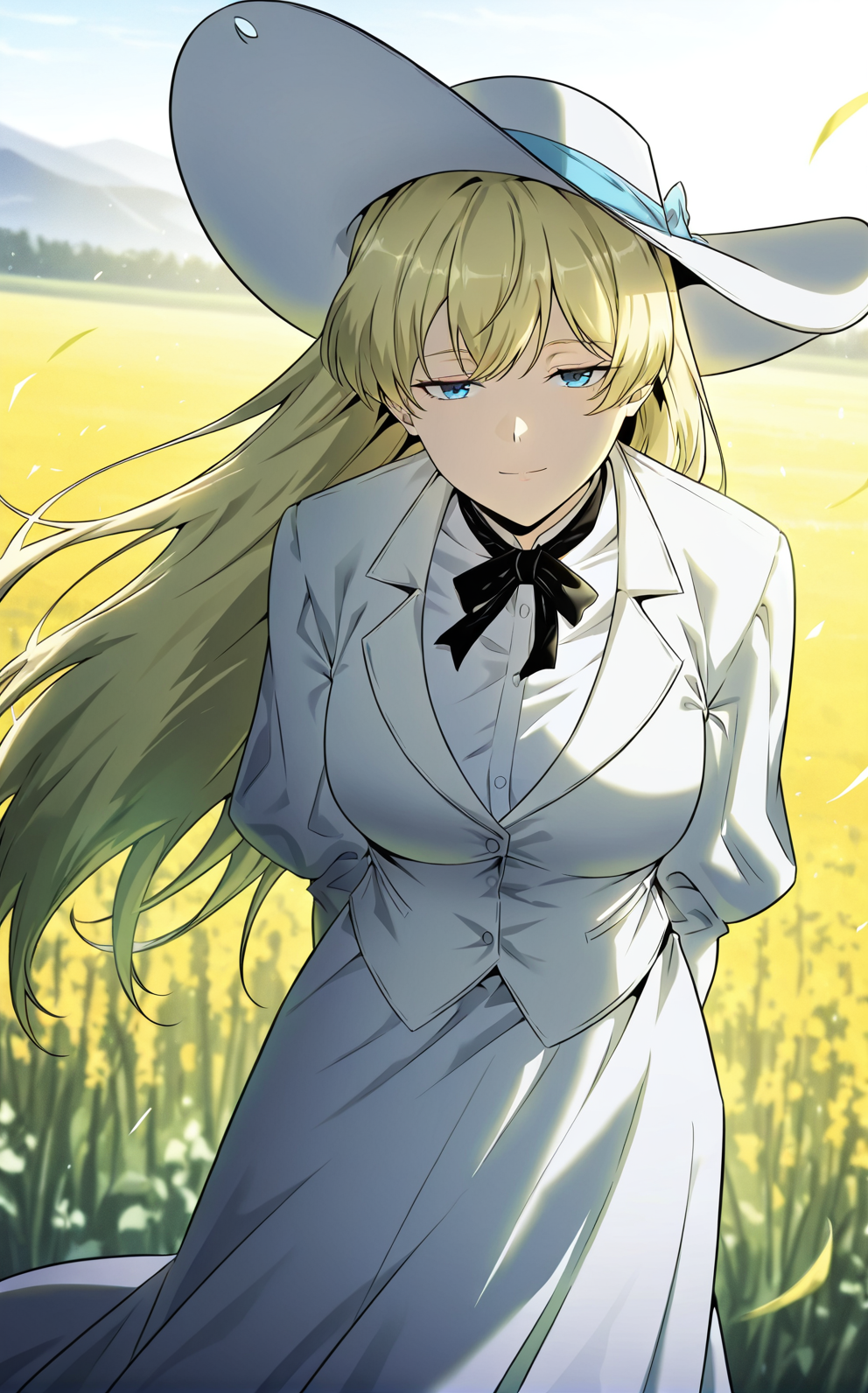 찰로, 1소녀, 혼자, 파란 눈, 금발, 긴 머리, 곧은 머리, 불균형한 앞머리, 눈 사이의 머리카락, 흰 모자, 넓은 모자 끝, 하늘색 모자 리본,