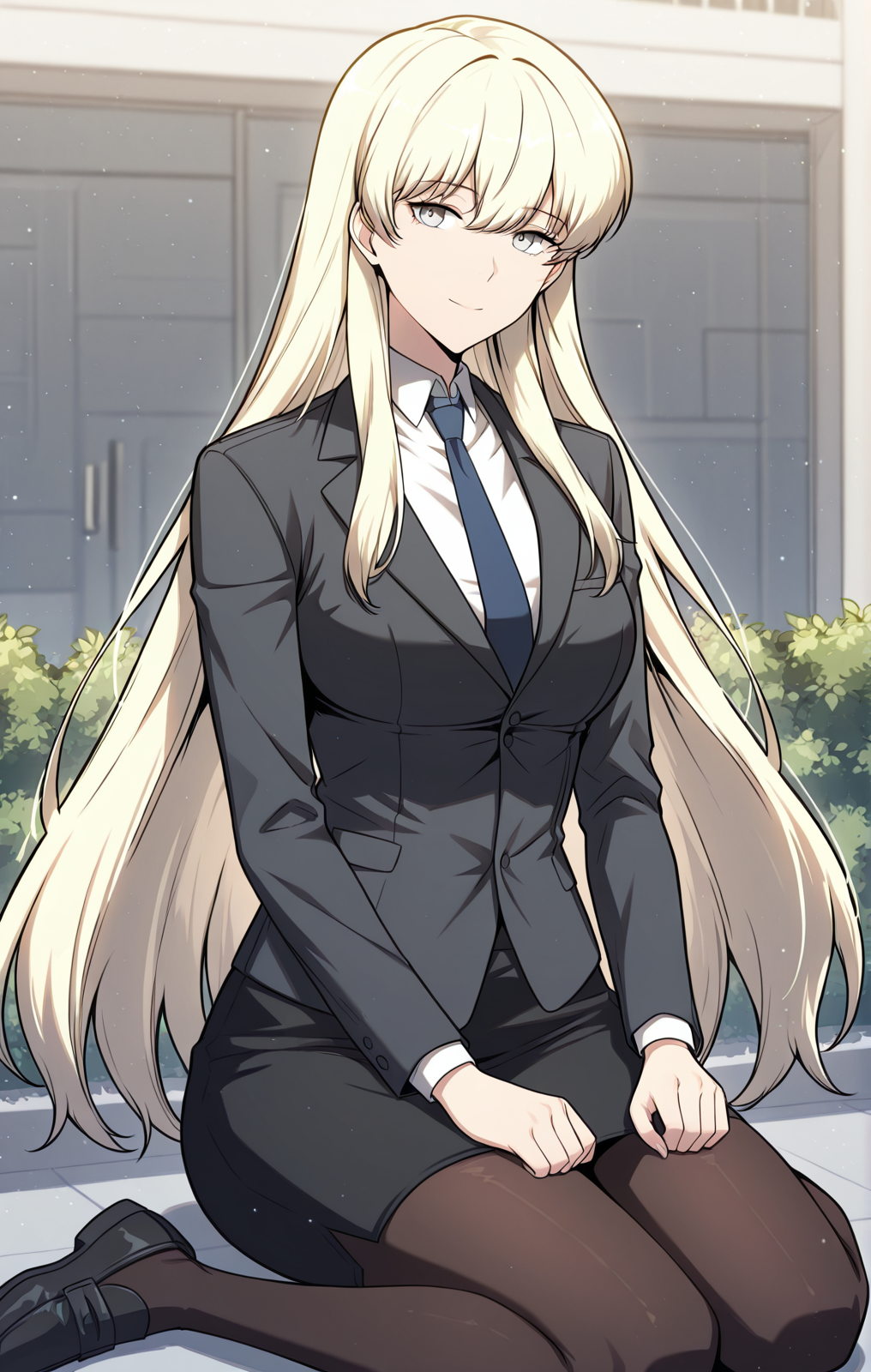 메리엘_아우트피트1, 진회색 블레이저, 단추 달린 블레이저, 긴 소매, 흰 셔츠, 칼라 셔츠, 파란 넥타이, 검은 치마, 핏된 치마, 연필 치마, 검은 팬티스타킹, 투명 팬티스타킹, 검은 로퍼